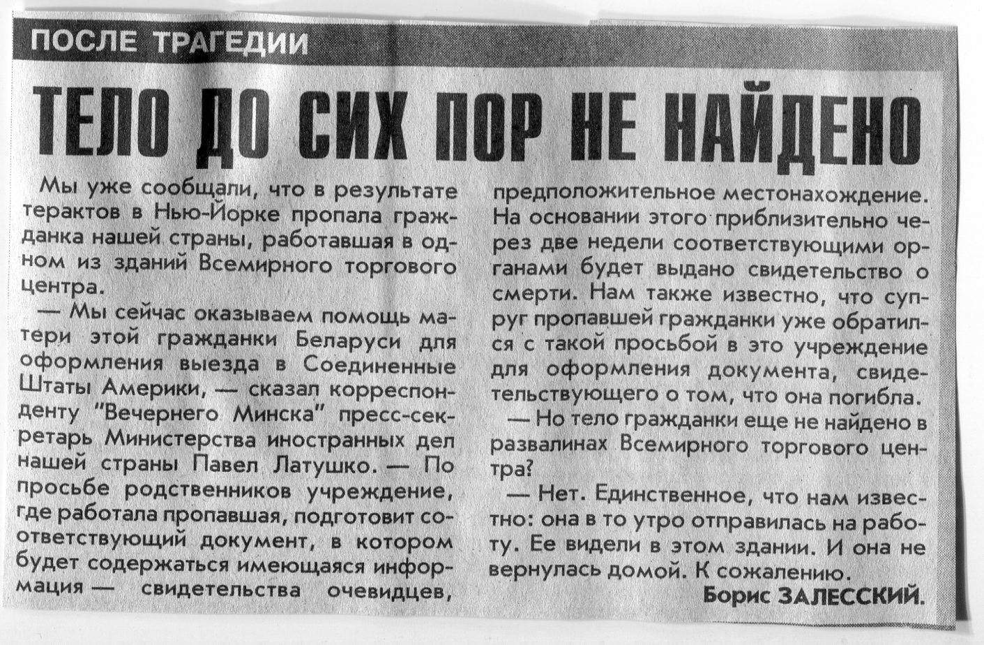 Залесский, Б. Тело до сих пор не найдено / Б. Залесский // Вечерний Минск. - 2001. - 8 окт.