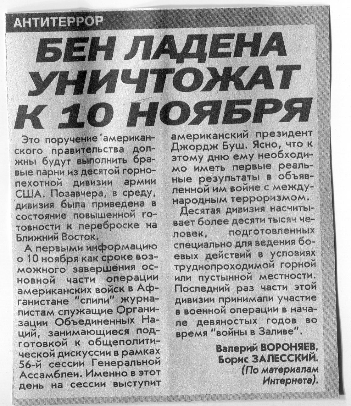 Залесский, Б. Бен Ладена уничтожат к 10 ноября / Б. Залесский, В. Вороняев // Вечерний Минск. - 2001. - 5 окт.