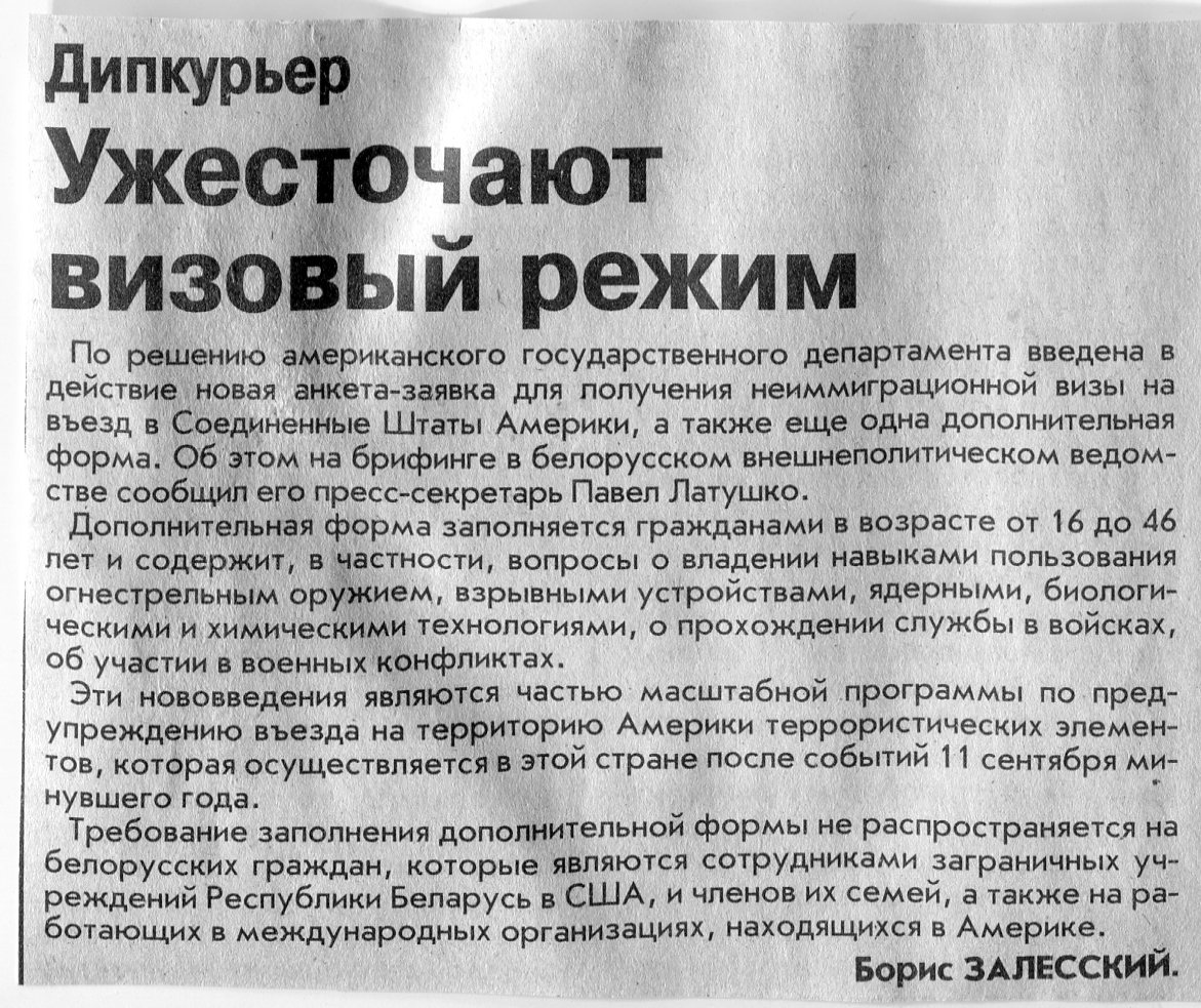 Залесский, Б. Ужесточают визовый режим / Б. Залесский // Вечерний Минск. - 2002. - 30 янв.