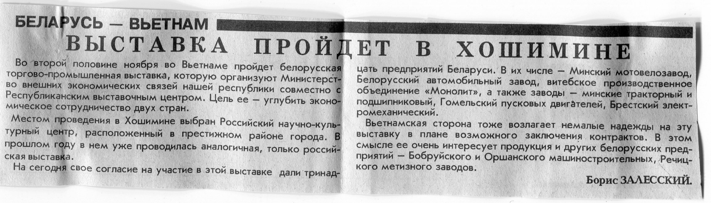 Залесский, Б. На выставку - в Хошимин / Б. Залесский // Вечерний Минск. - 1995. - 20 нояб.