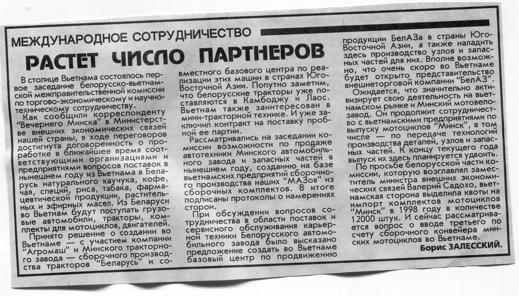 Залесский, Б. Растет число партнеров / Б. Залесский // Вечерний Минск. - 1998. - 21 янв.