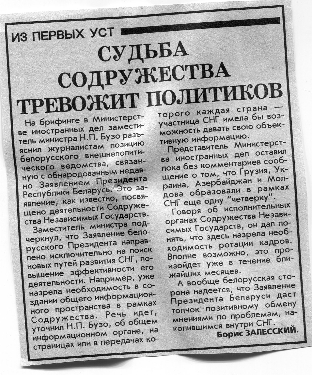 Залесский, Б. Судьба содружества тревожит политиков / Б. Залесский // Вечерний Минск. - 1997. - 1 дек.