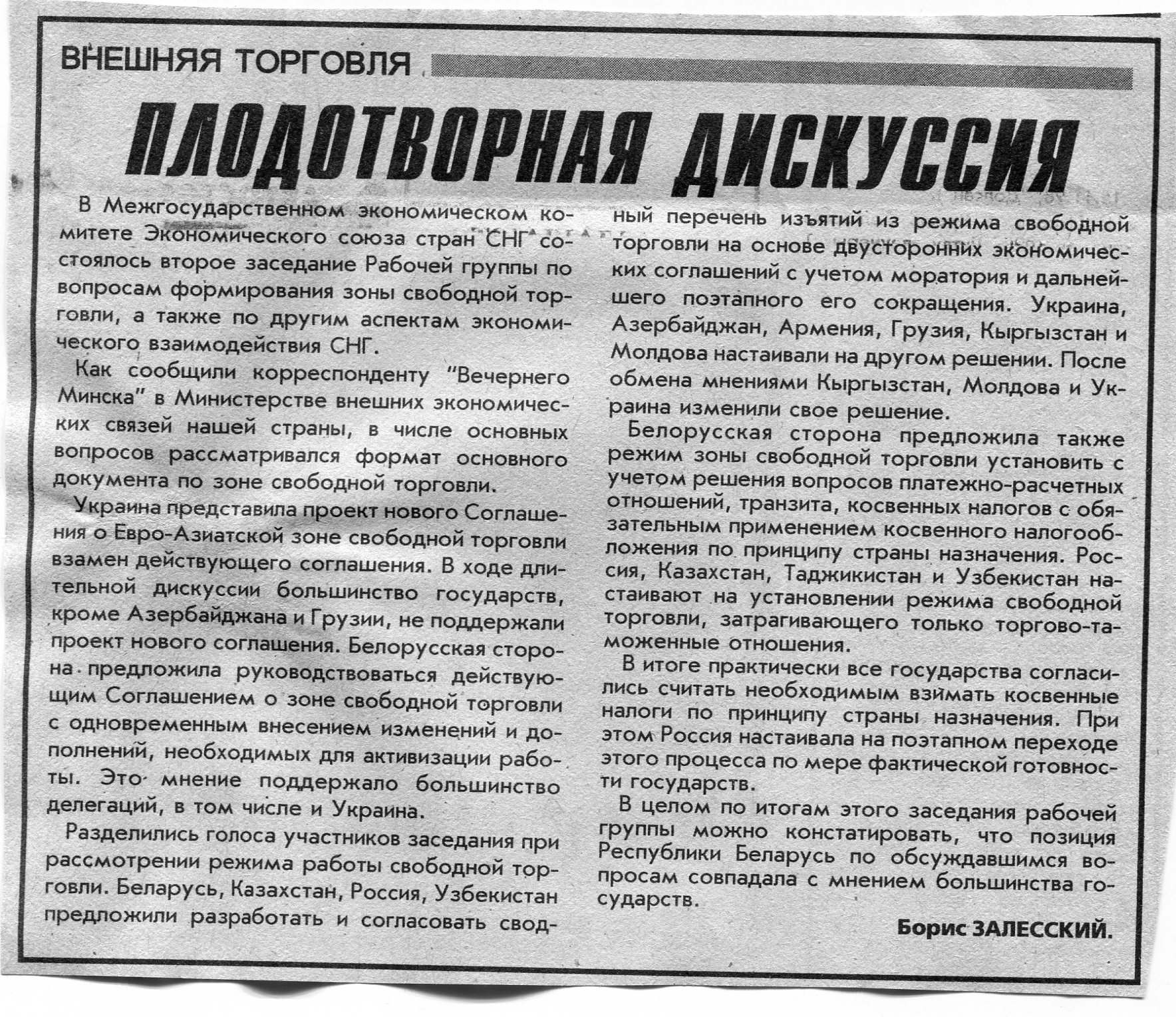 Залесский, Б. На пути к зоне свободной торговли / Б. Залесский // Вечерний Минск. - 2003. - 25 авг.