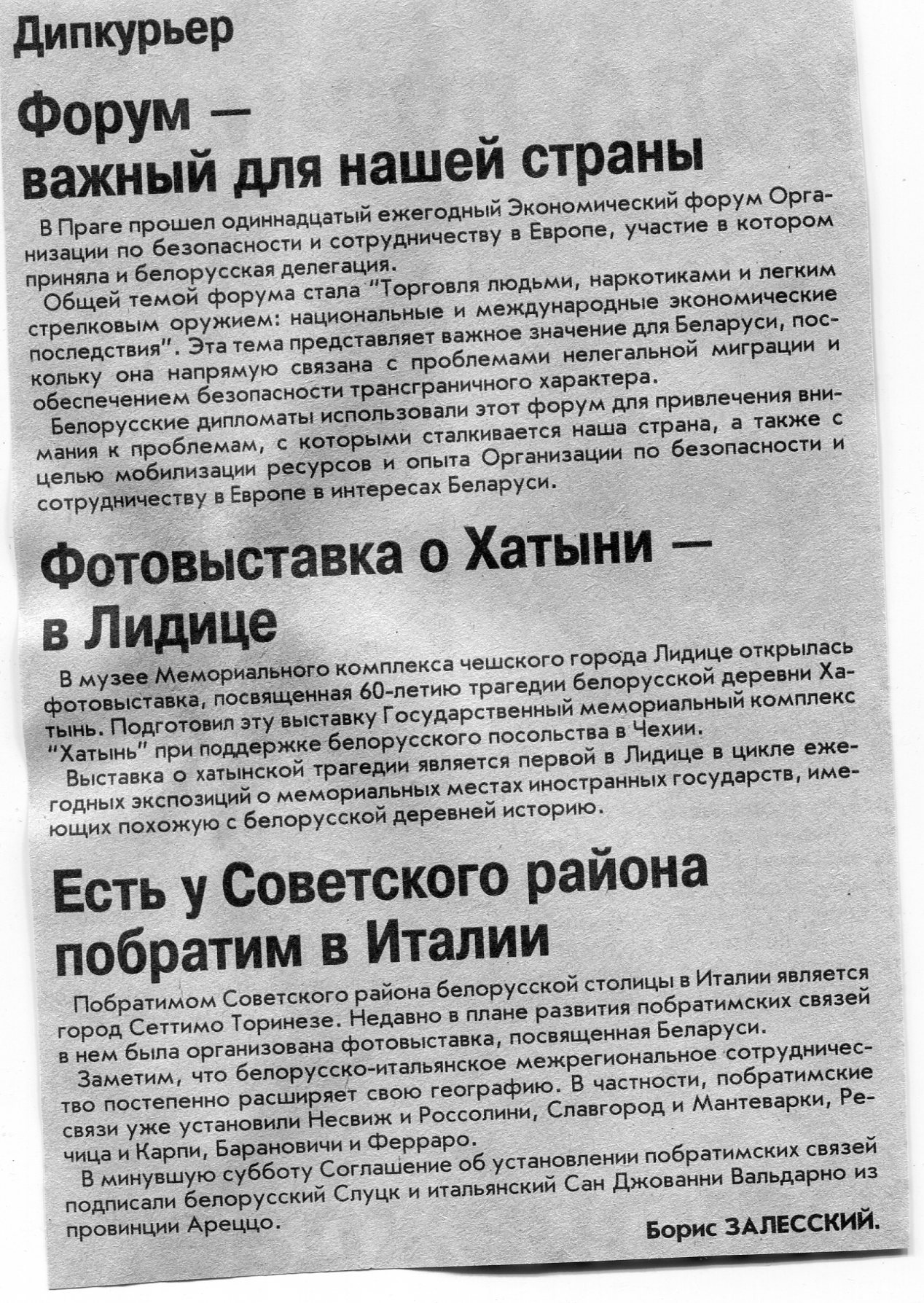 Залесский, Б. ОБСЕ не должна отворачиваться от проблем / Б. Залесский // Вечерний Минск. - 1999. - 19 мая.