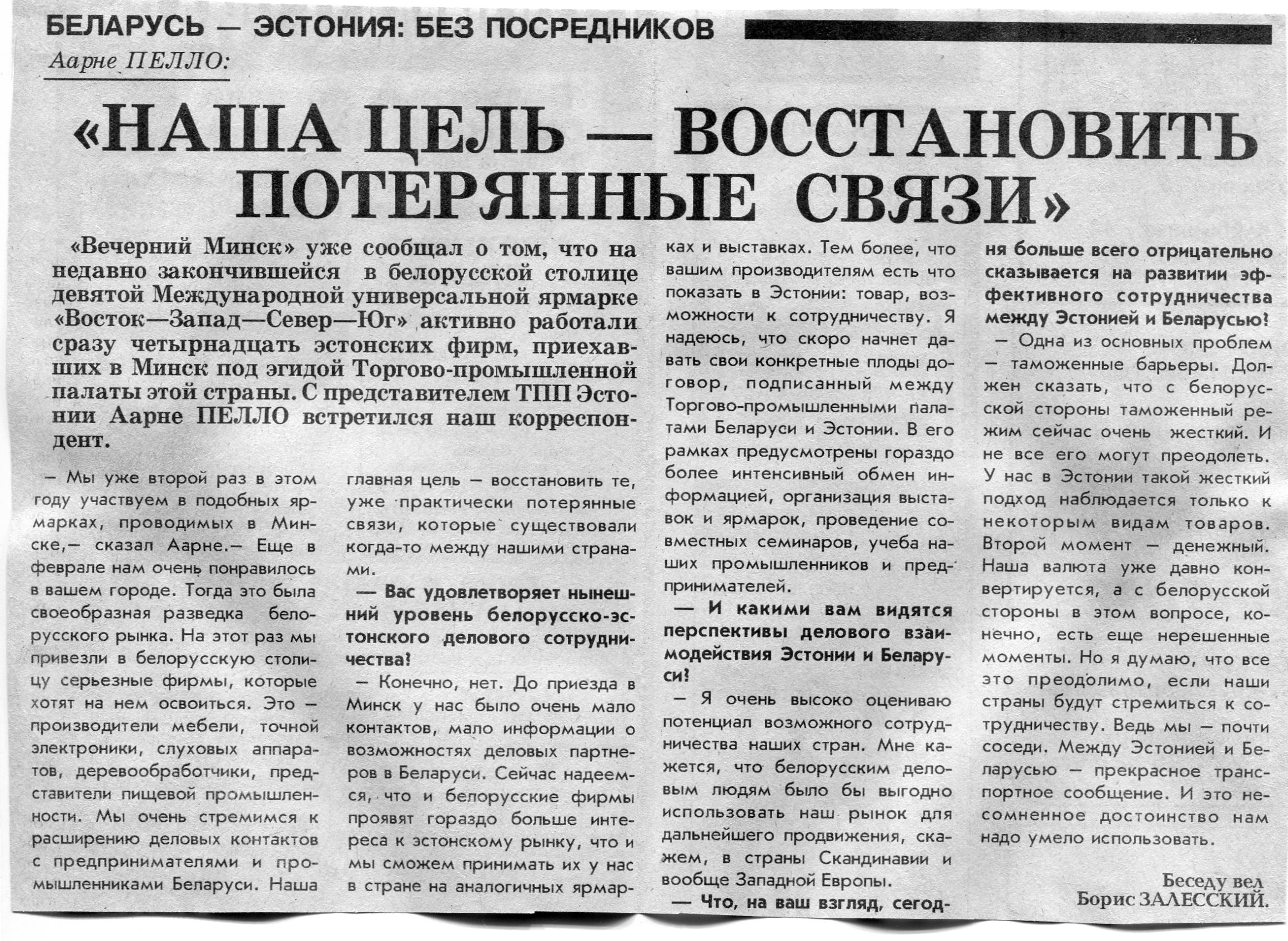 Залесский, Б. Аарне Пелло: "Наша цель - восстановить потерянные связи" / Б. Залесский // Вечерний Минск. - 1995. - 19 апр.