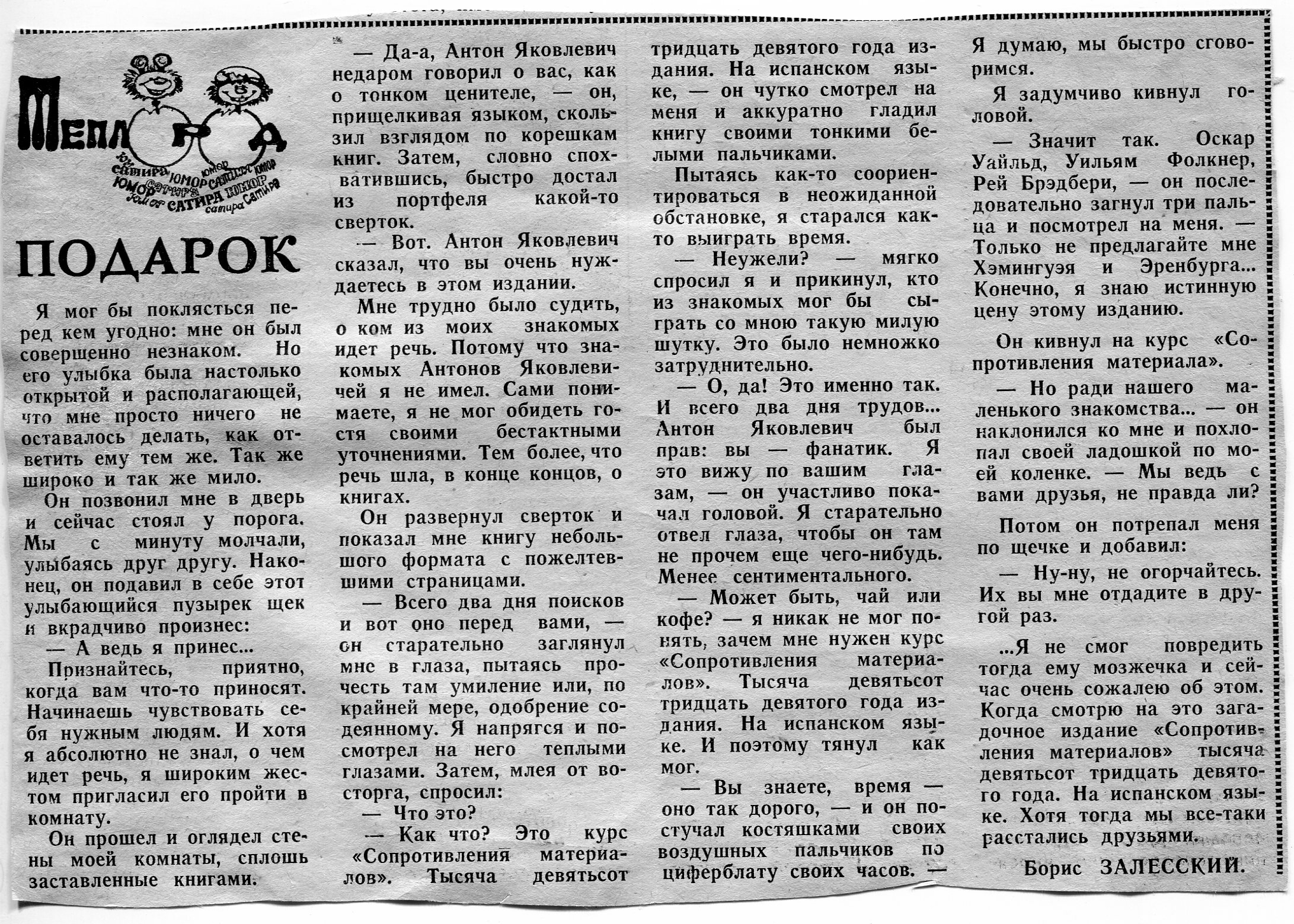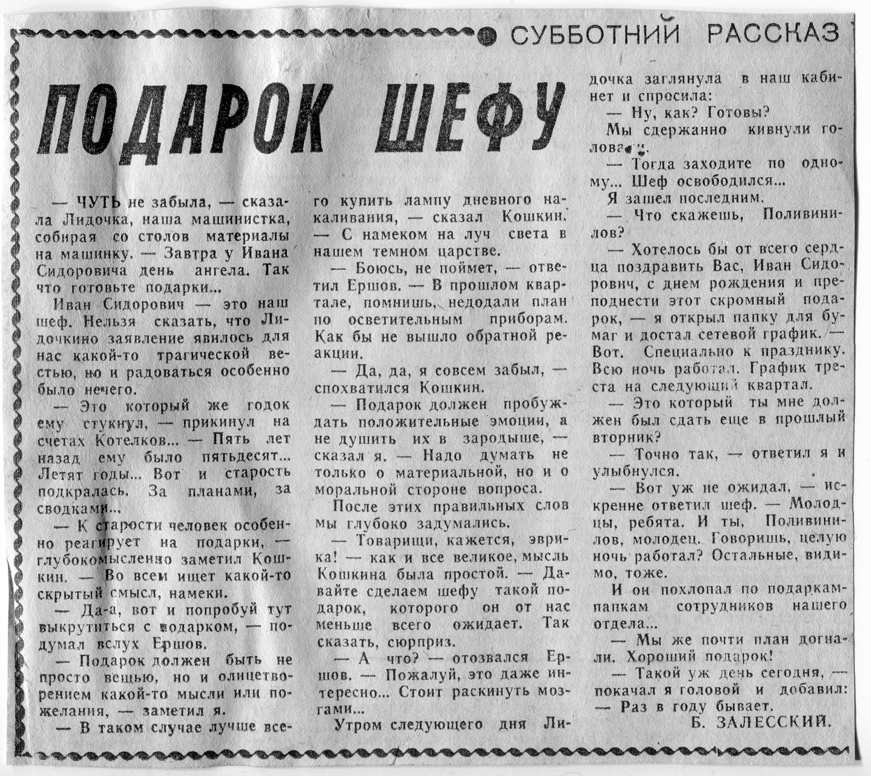Залесский, Б. Подарок / Б. Залесский // Советский инженер. - 1976. - 22 окт.