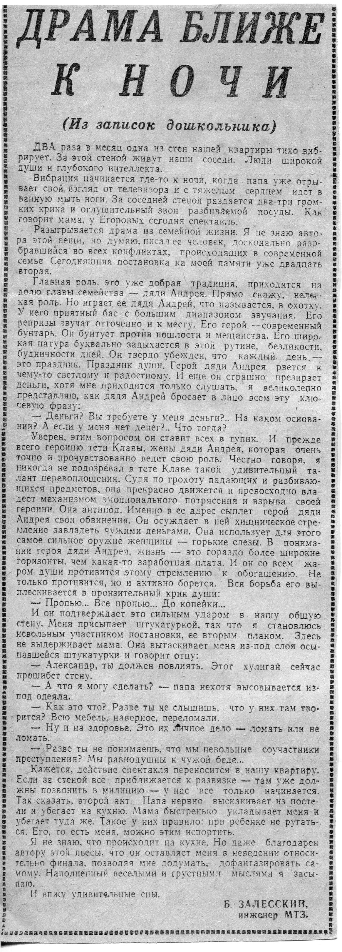Залесский, Б. Драма ближе к ночи / Б. Залесский // Трактор. - 1978. - 25 мар.