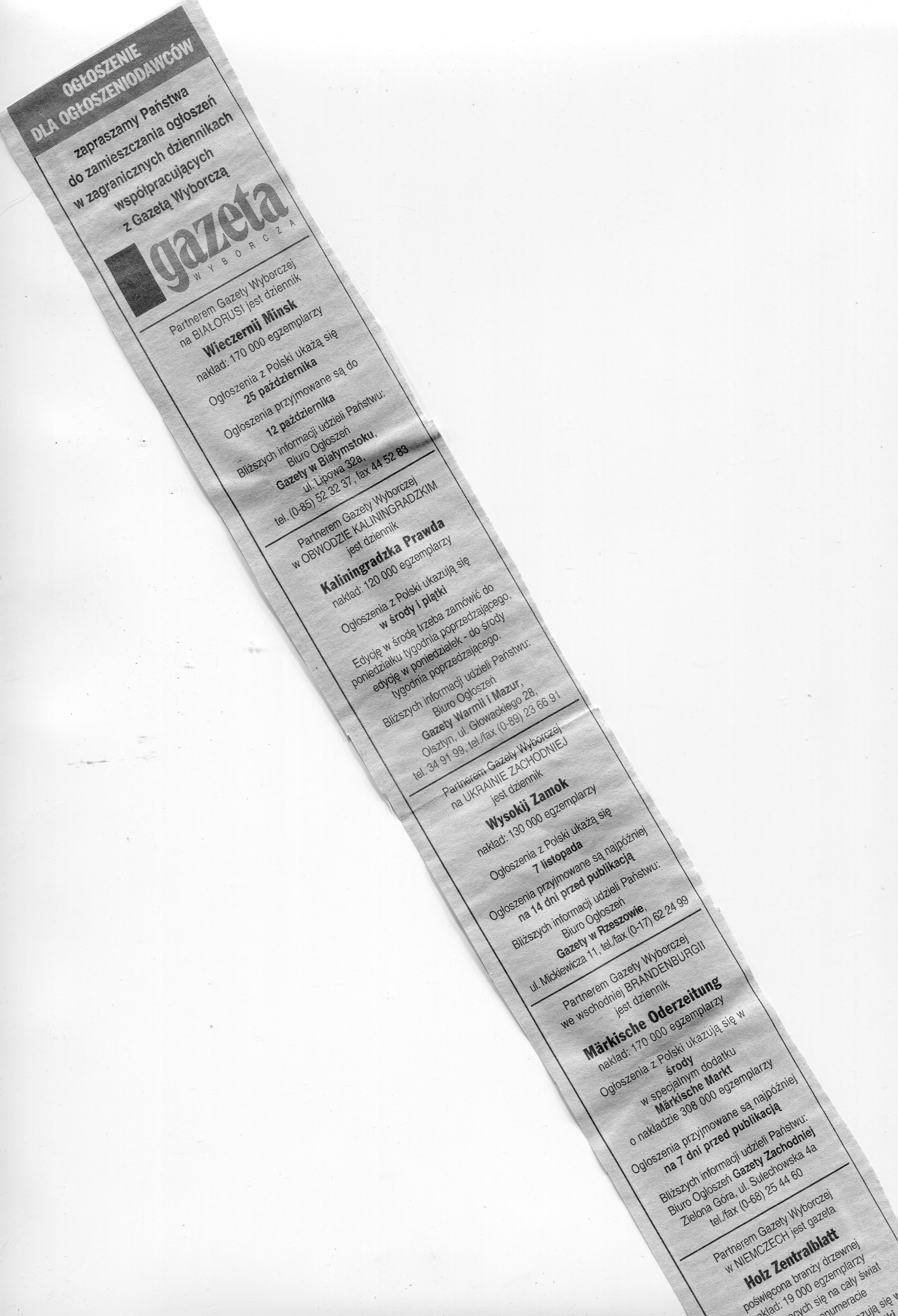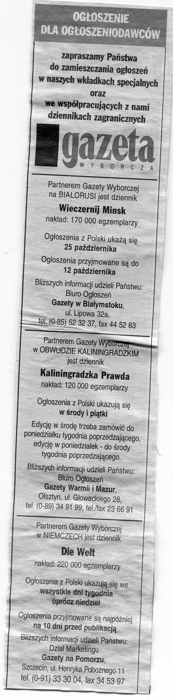 Ogloszenie dla ogloczeniodawcow // Gazeta Wyborcza. – 1996. – 11 сент.