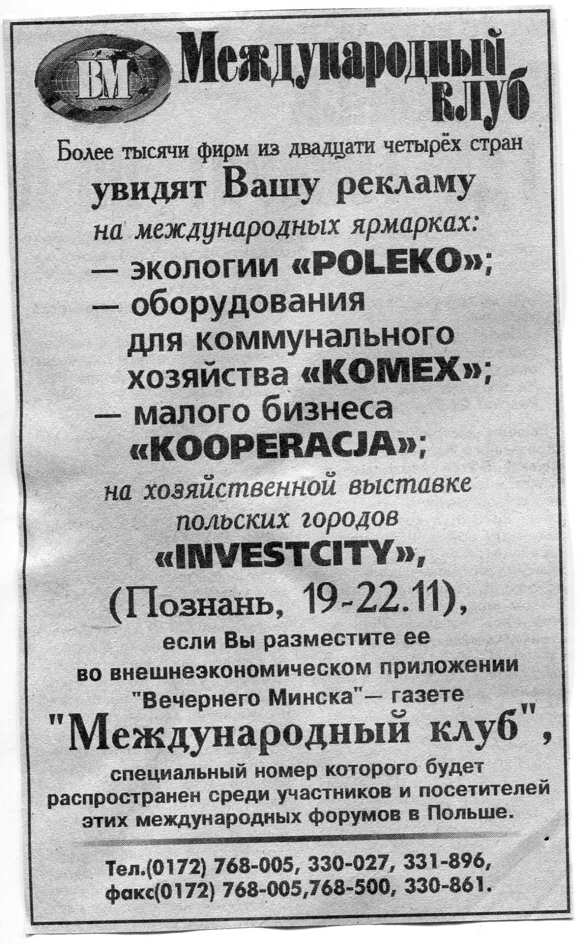 Международный клуб // Вечерний Минск. - 1996.- 28 окт.