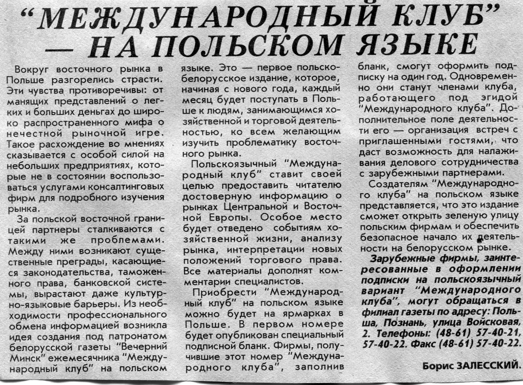 Залесский, Б. "Международный клуб" - на польском языке / Б. Залесский // Вечерний Минск. - 1996. - 18 нояб.