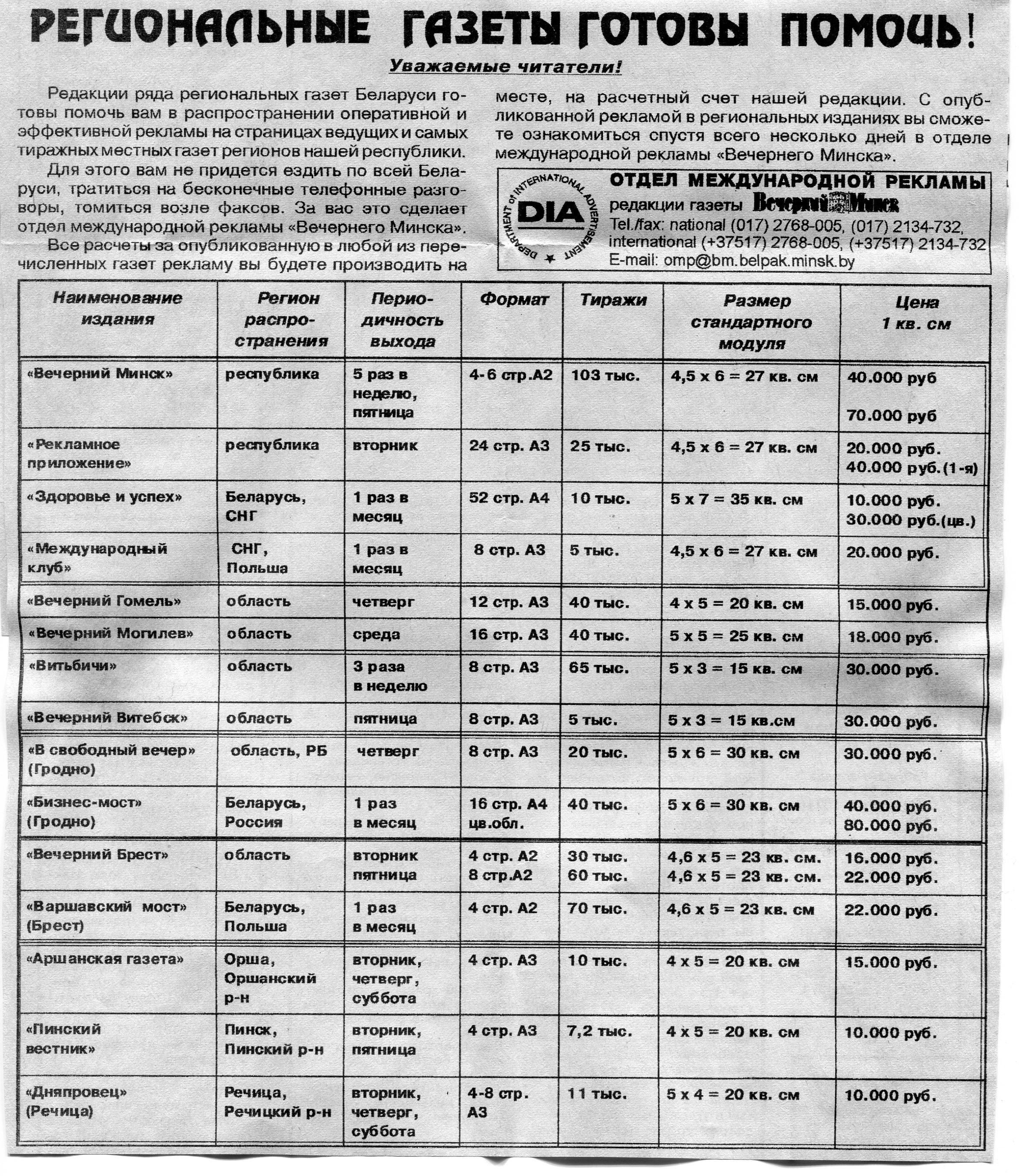 Региональные газеты готовы помочь! // Вечерний Минск. - 1997. - 2 мая.