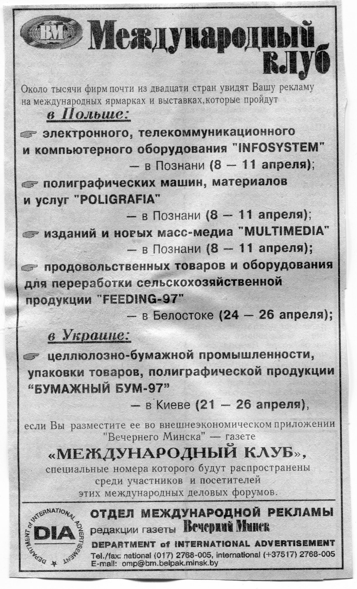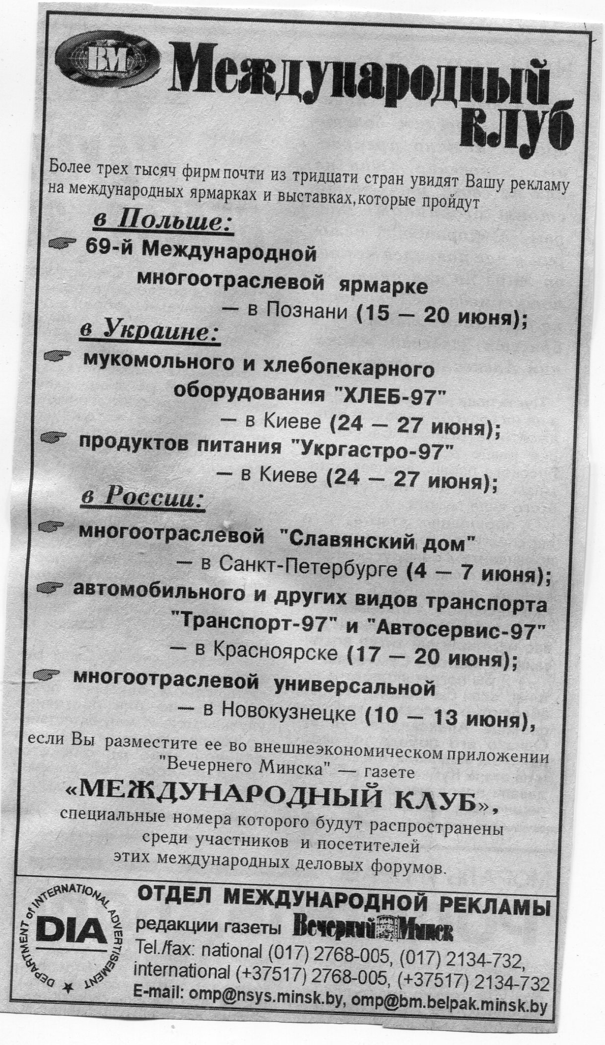Международный клуб // Вечерний Минск. - 1997.- 26 мар.