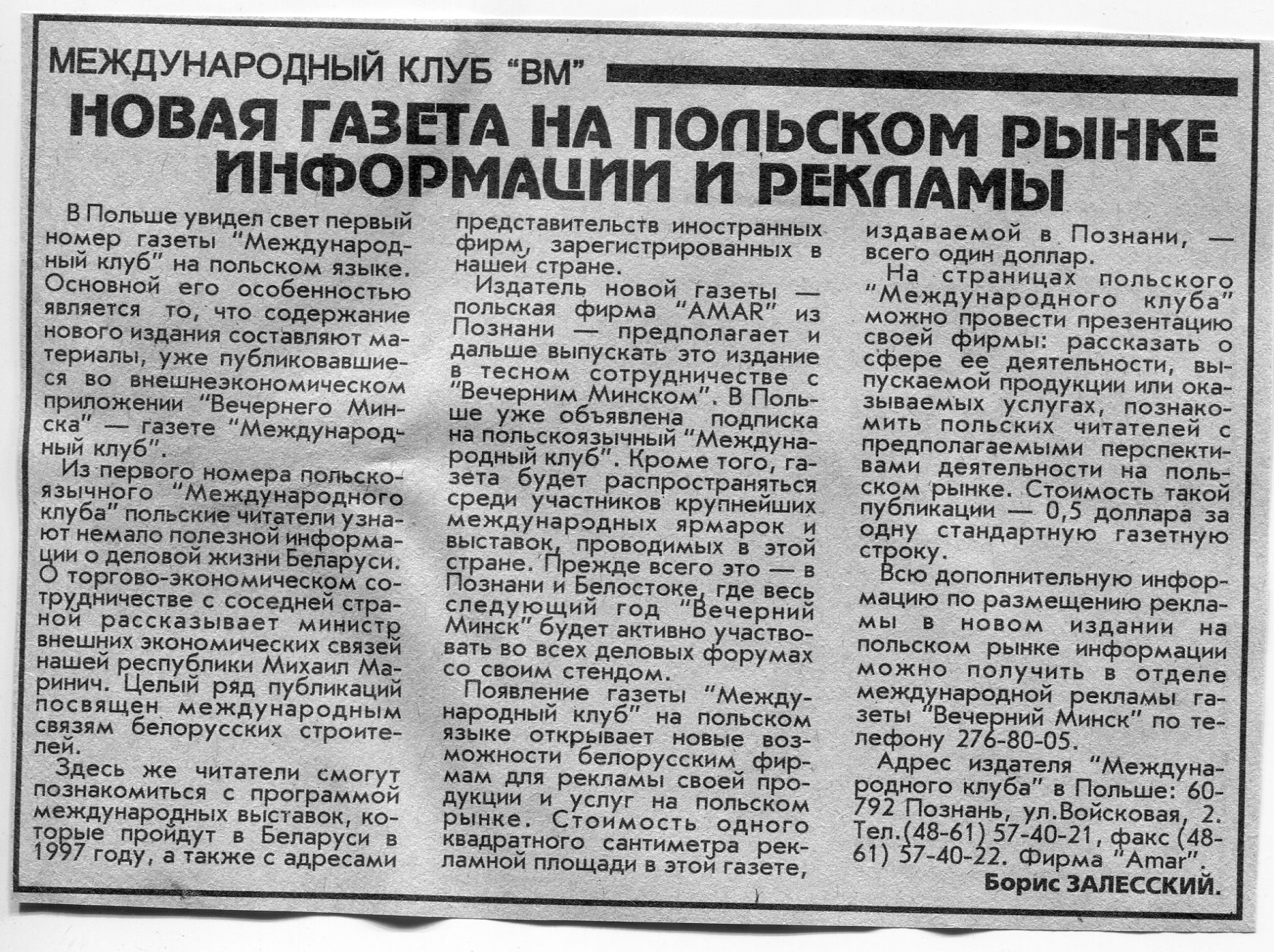 Залесский, Б. Новая газета на польском рынке информации и рекламы / Б. Залесский // Вечерний Минск. - 1996. - 27 дек.