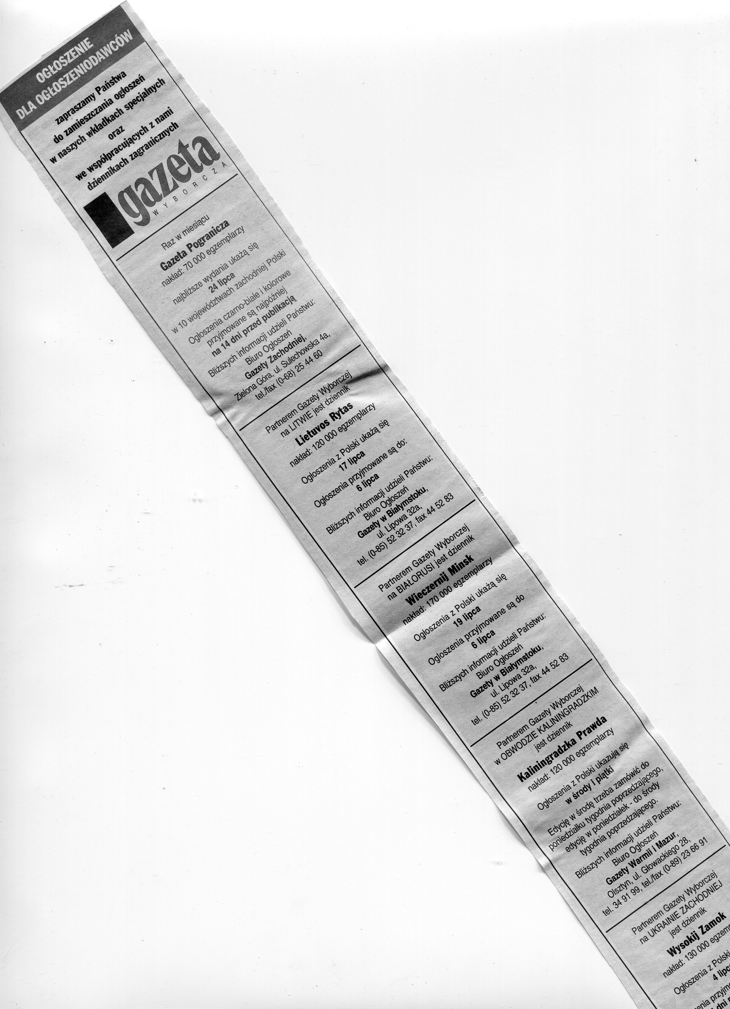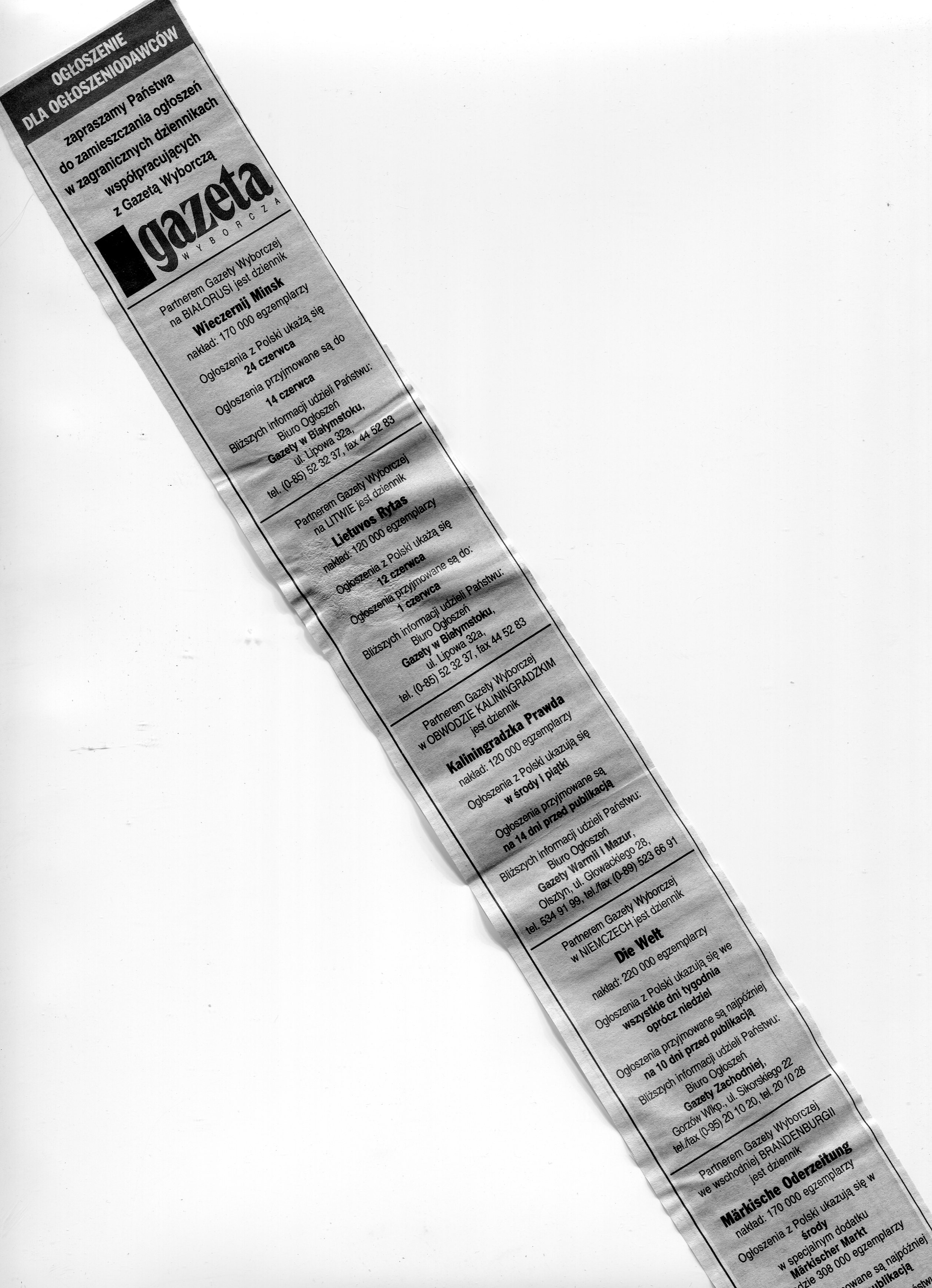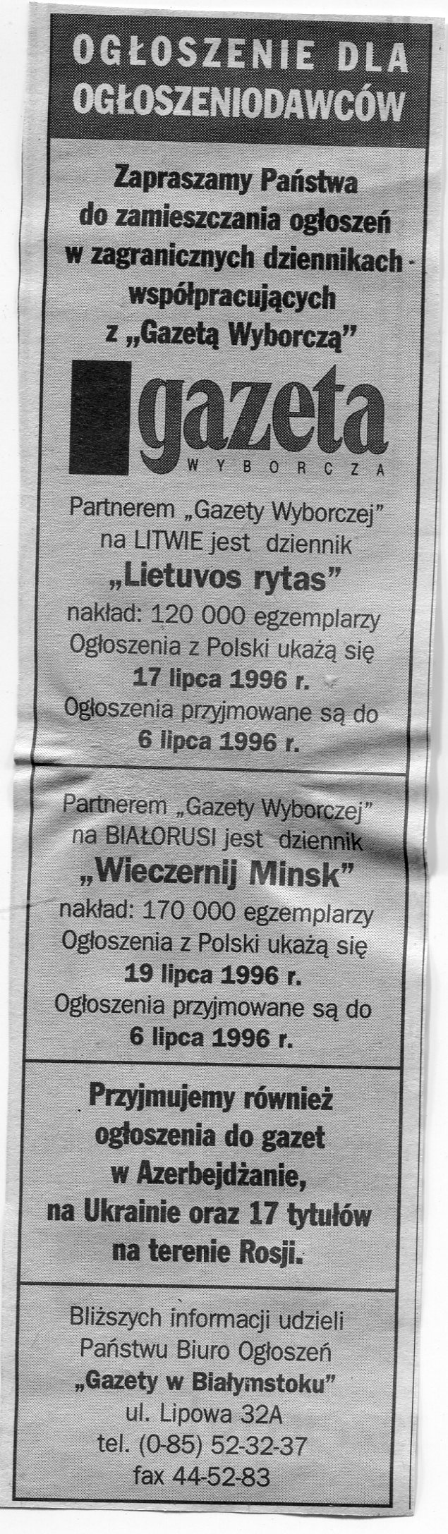 Ogloszenie dla ogloczeniodawcow // Gazeta Wyborcza. – 1996. – 19 июн.