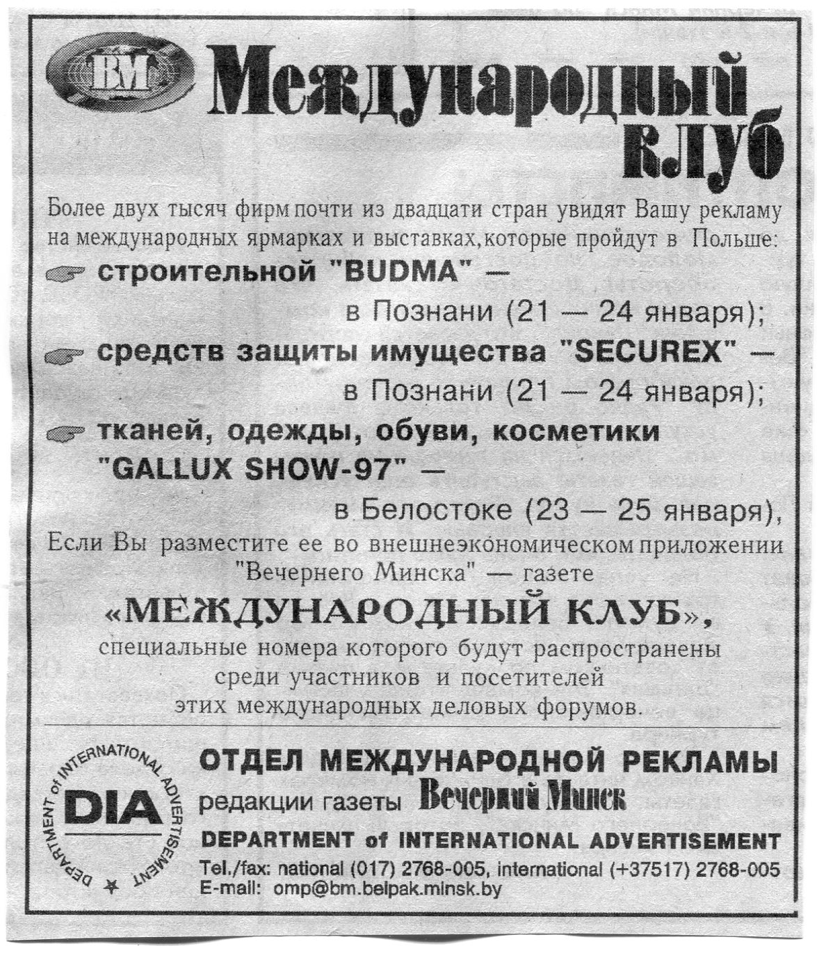 Международный клуб // Вечерний Минск. - 1997.- 8 янв.
