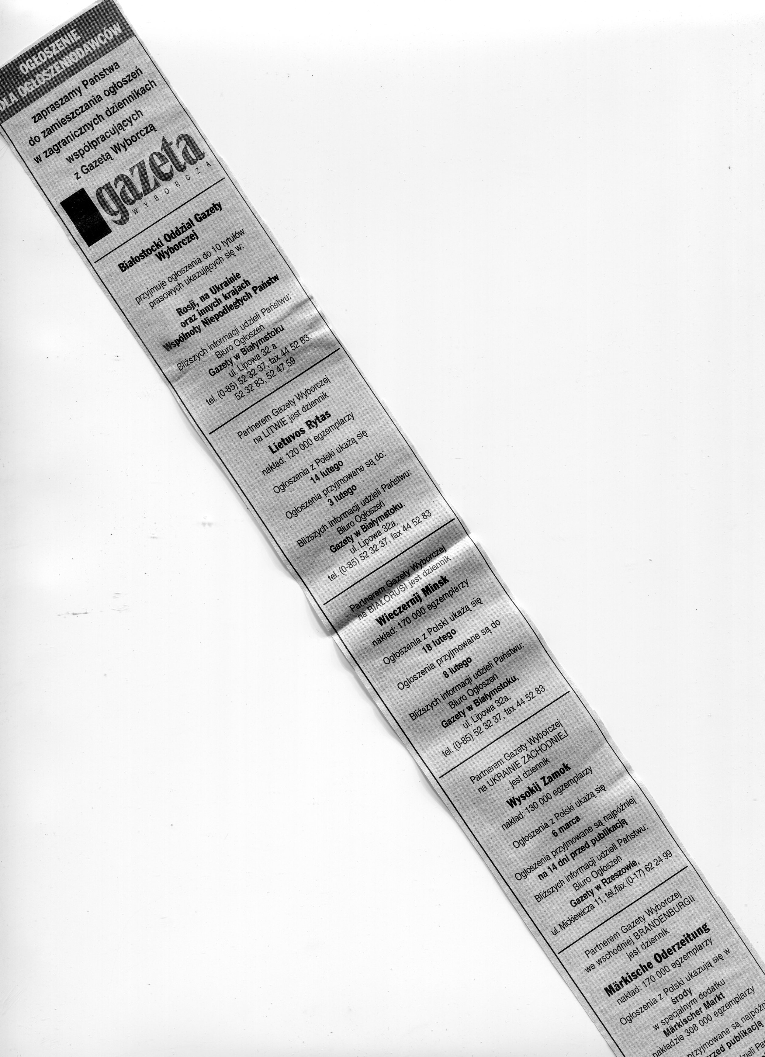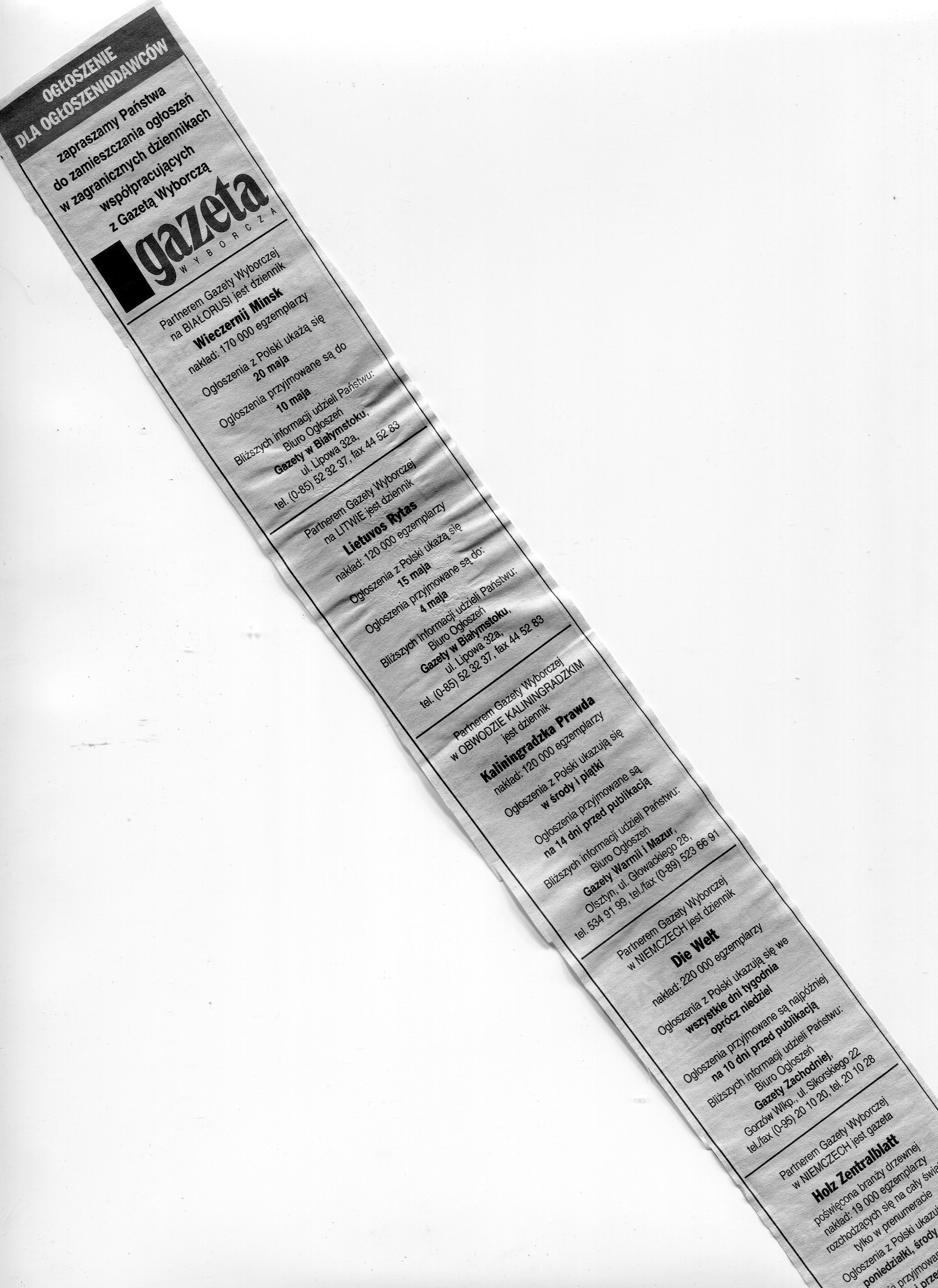 Ogloszenie dla ogloczeniodawcow // Gazeta Wyborcza. – 1997. – 21 мая.