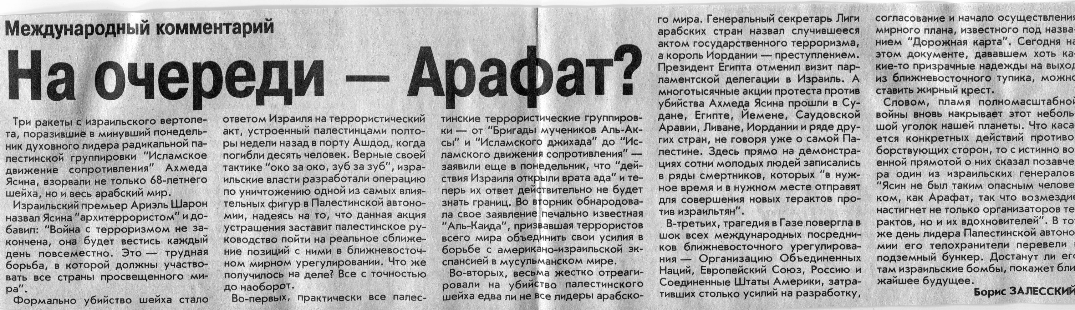 Залесский, Б. На очереди - Арафат? / Б. Залесский // Вечерний Минск. - 2004. - 24 мар.