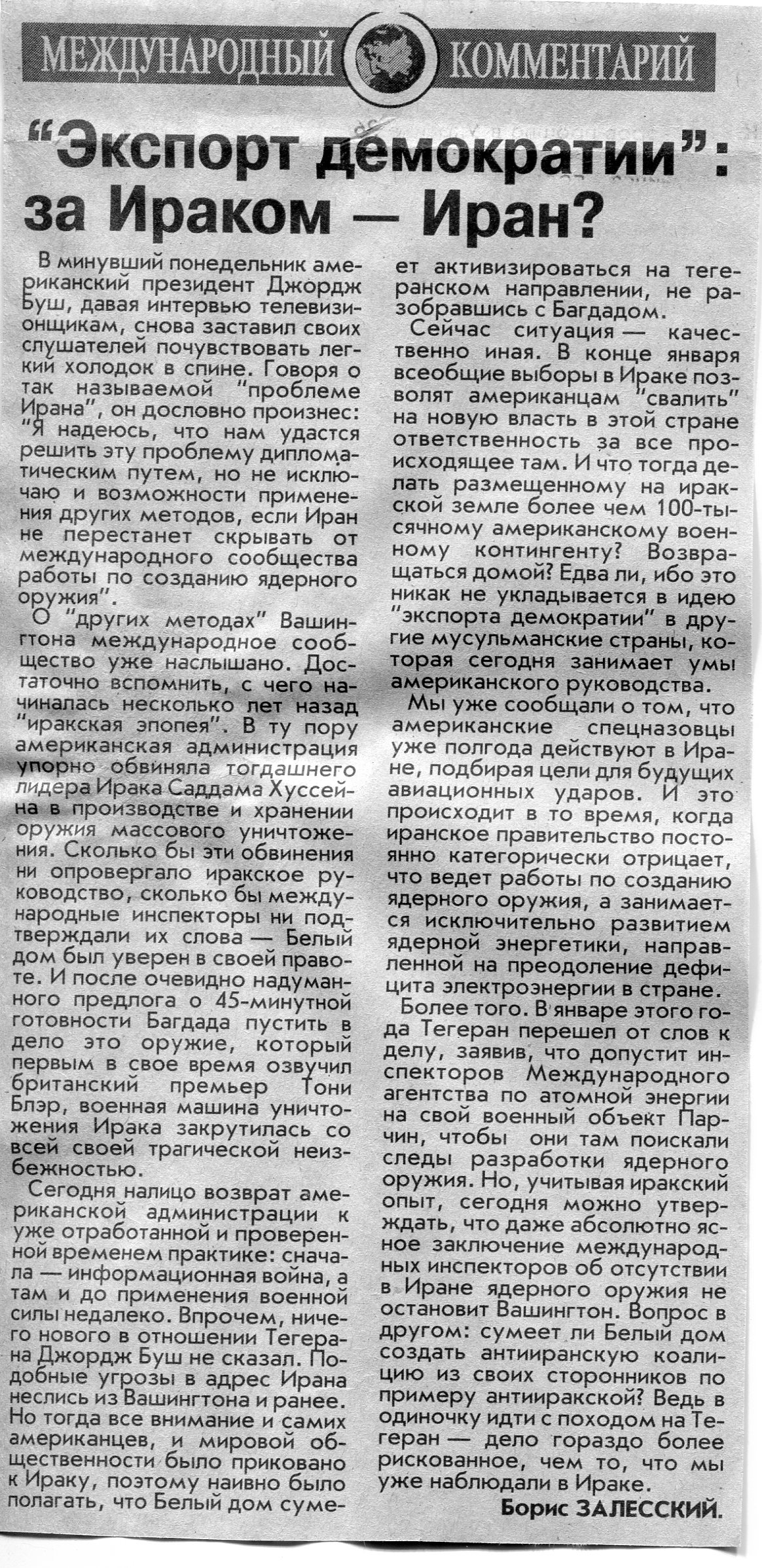 Залесский, Б. "Экспорт демократии": за Ираком - Иран? / Б. Залесский // Вечерний Минск. - 2005. - 20 янв.