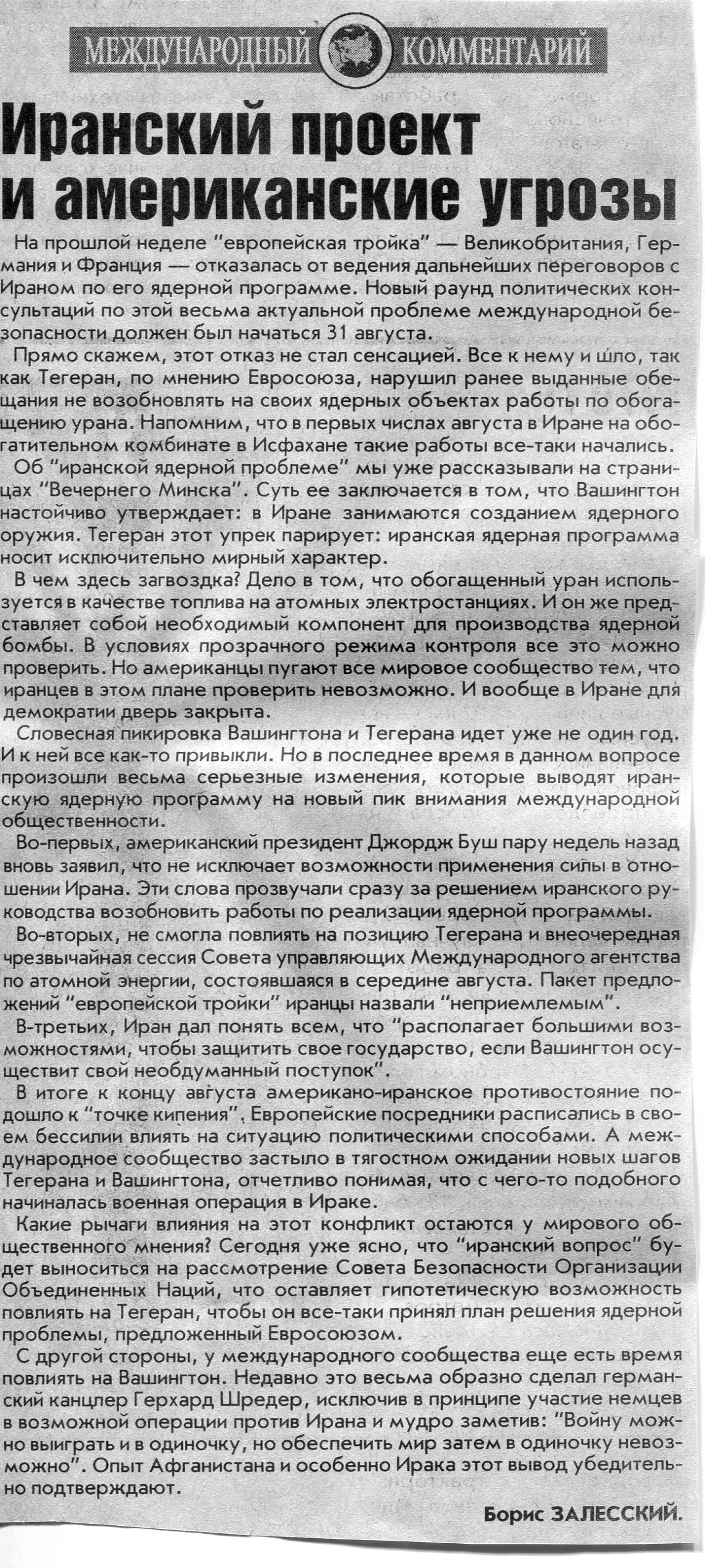 Залесский, Б. Иранский проект и американские угрозы / Б. Залесский // Вечерний Минск. - 2005. - 29 авг.