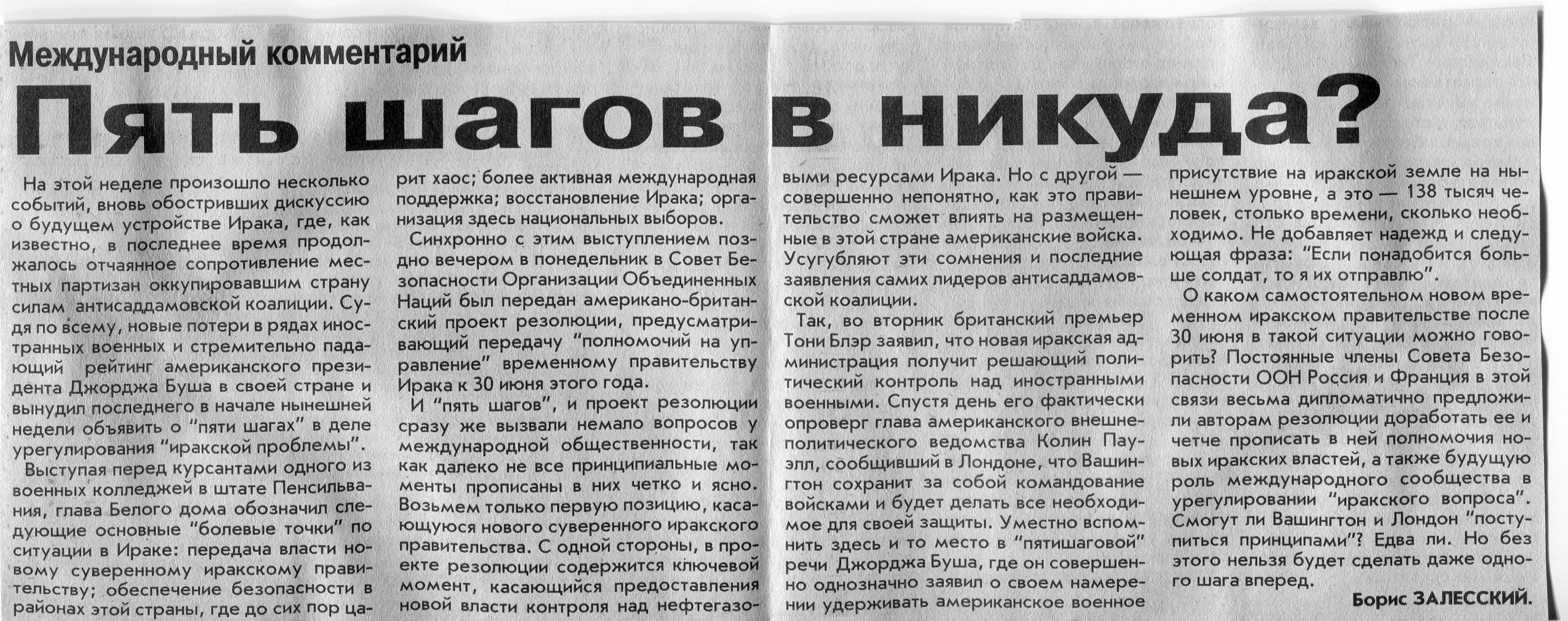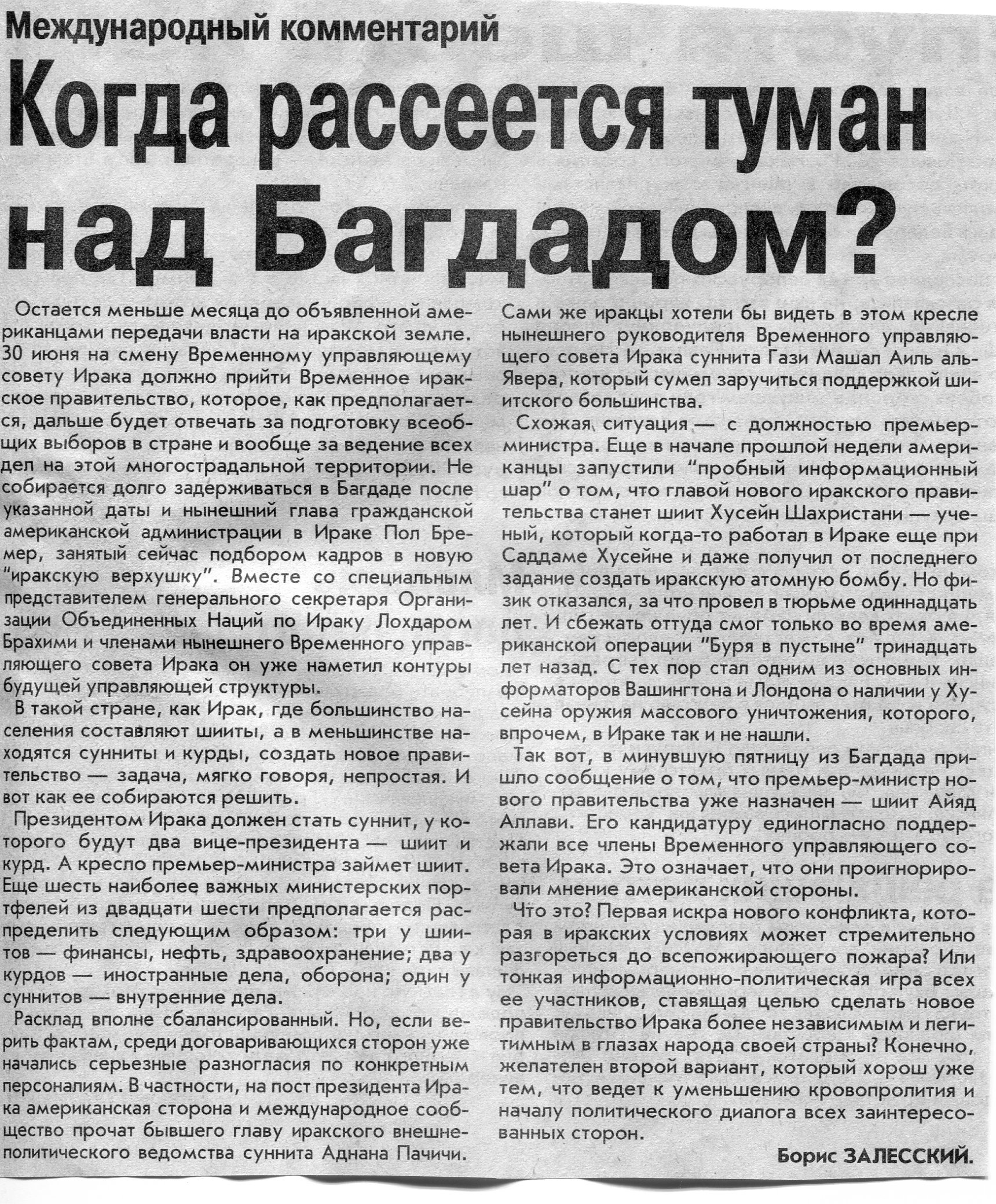 Залесский, Б. Когда рассеется туман над Багдадом? / Б. Залесский // Вечерний Минск. - 2004. - 2 июн.
