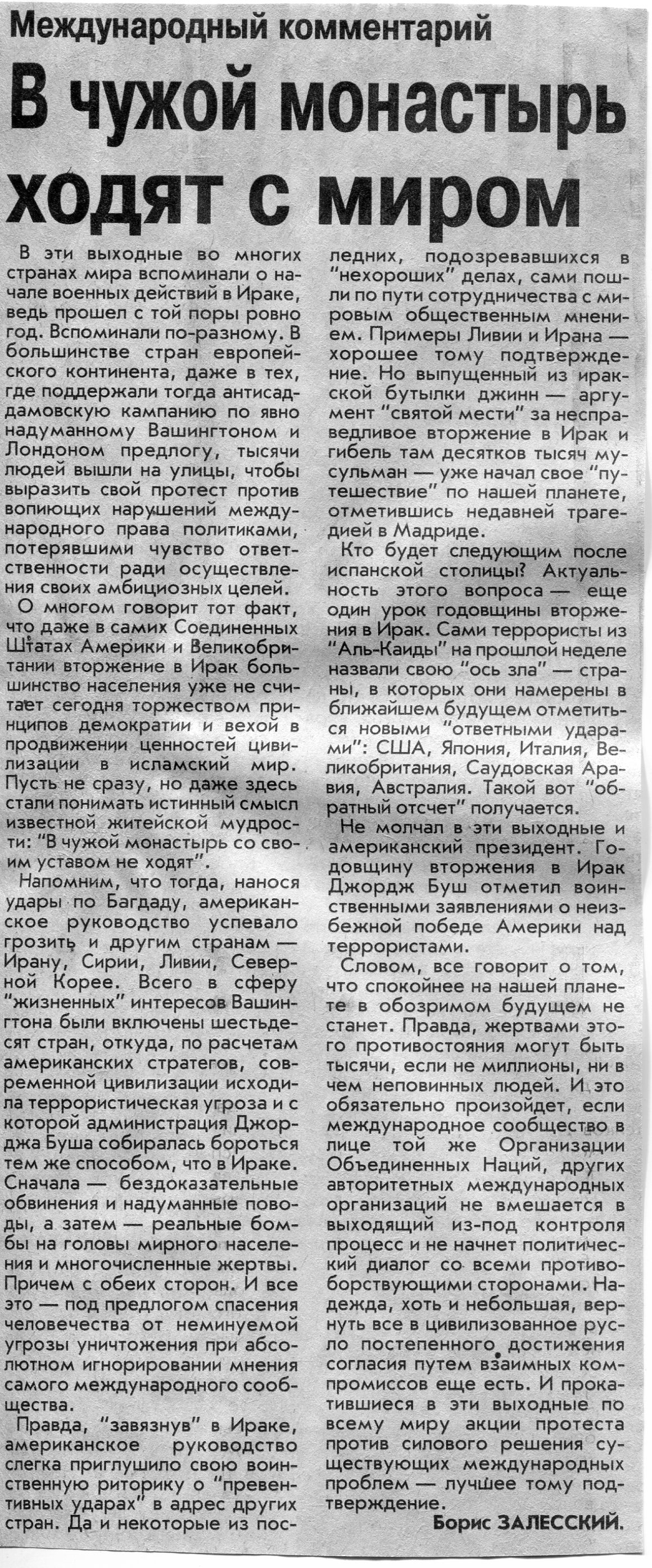 Залесский, Б. В чужой монастырь ходят с миром / Б. Залесский // Вечерний Минск. - 2004. - 22 мар.