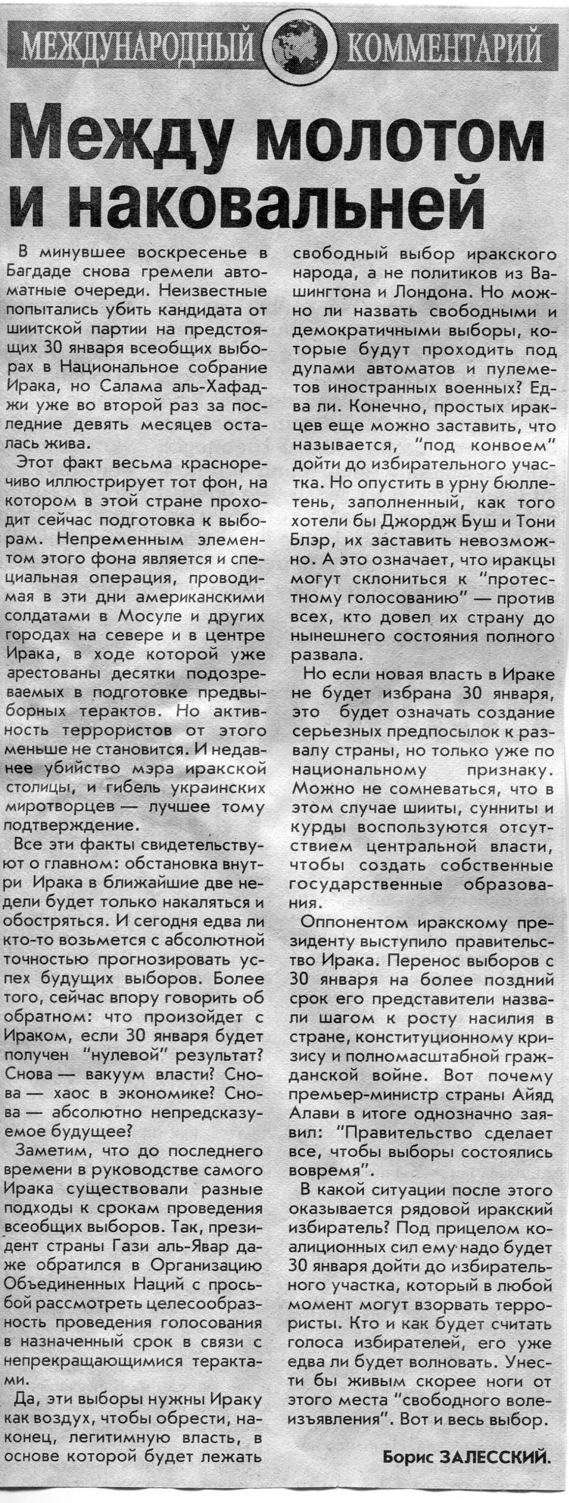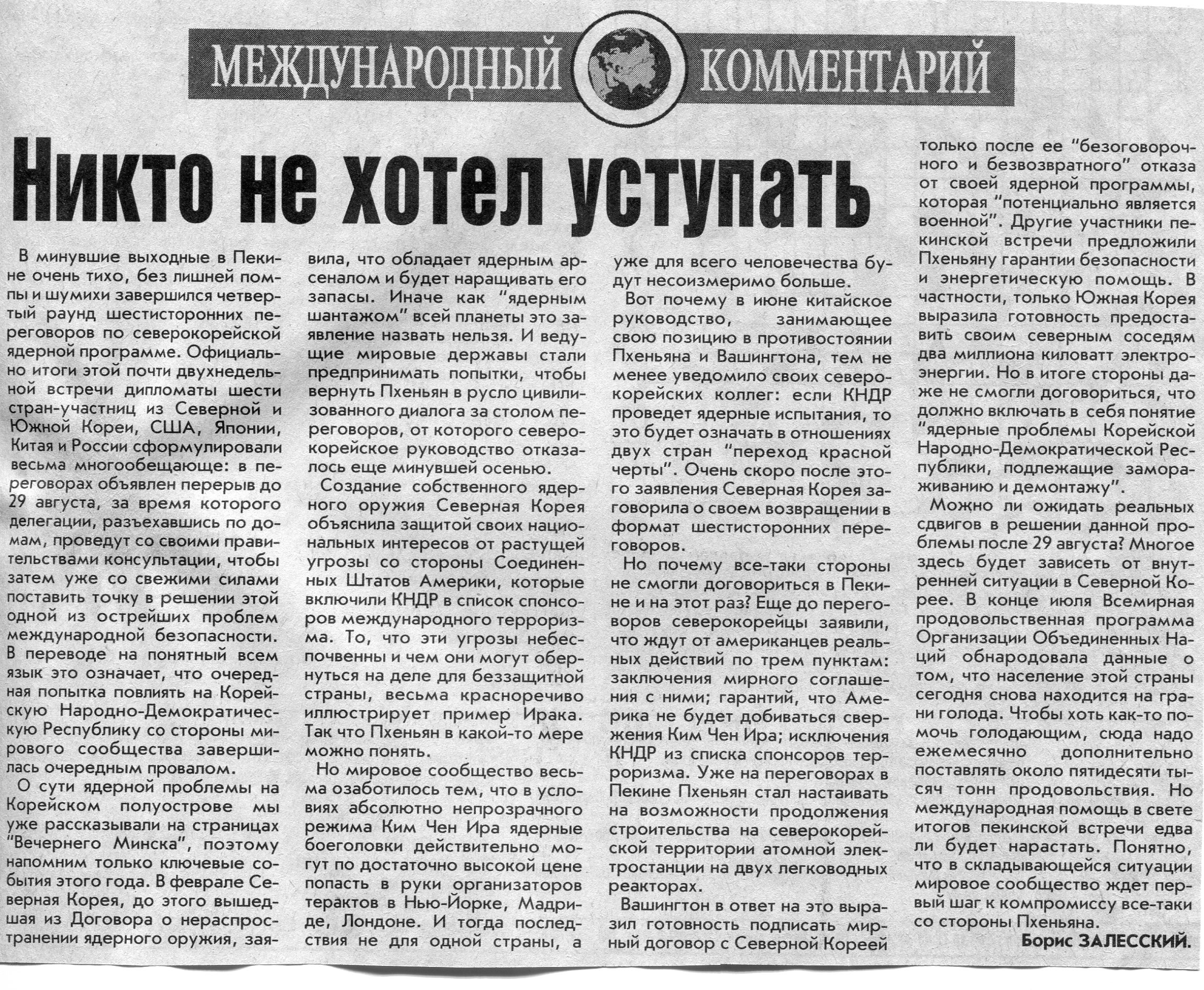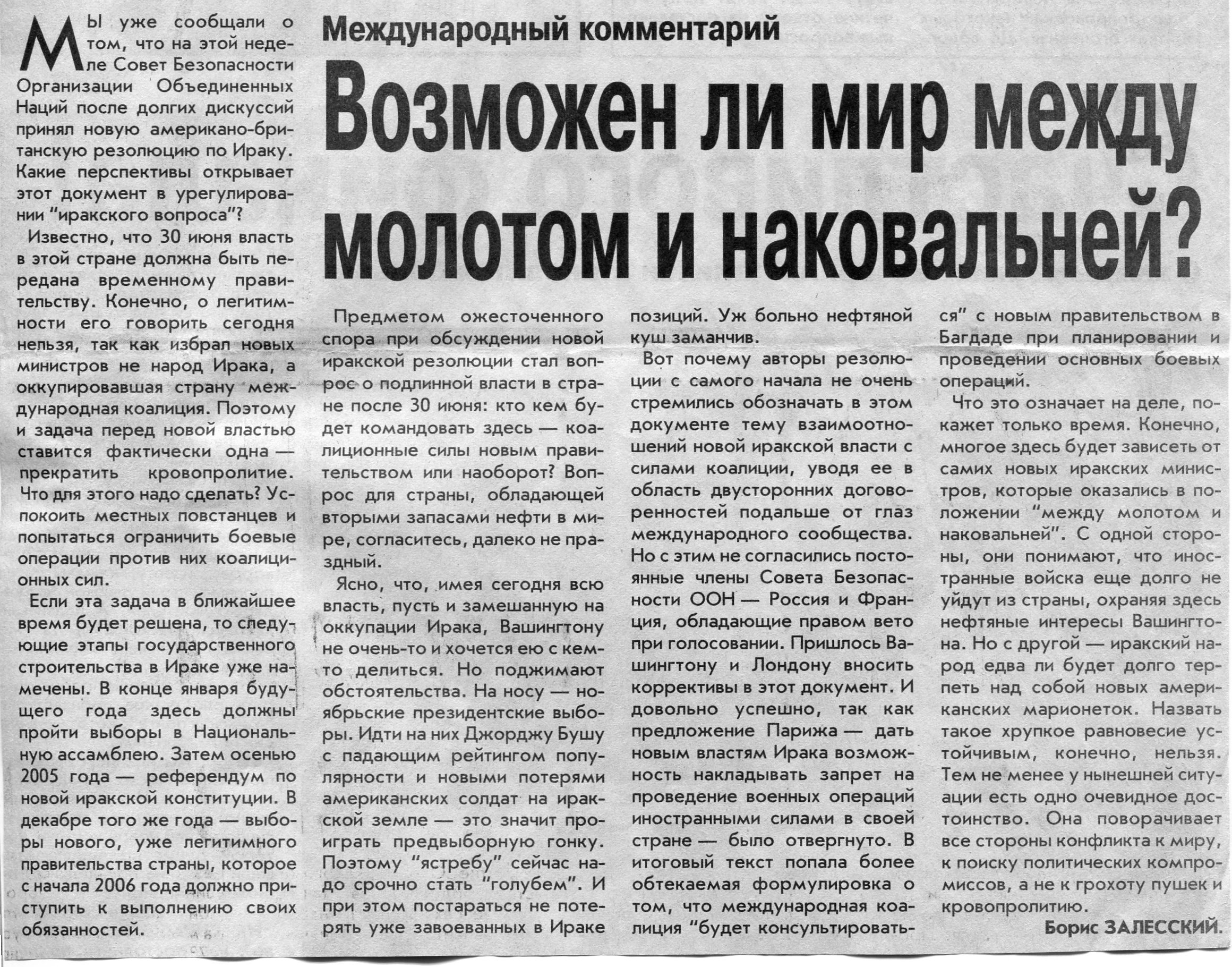 Залесский, Б. Возможен ли мир между молотом и наковальней? / Б. Залесский // Вечерний Минск. - 2004. - 11 июн.