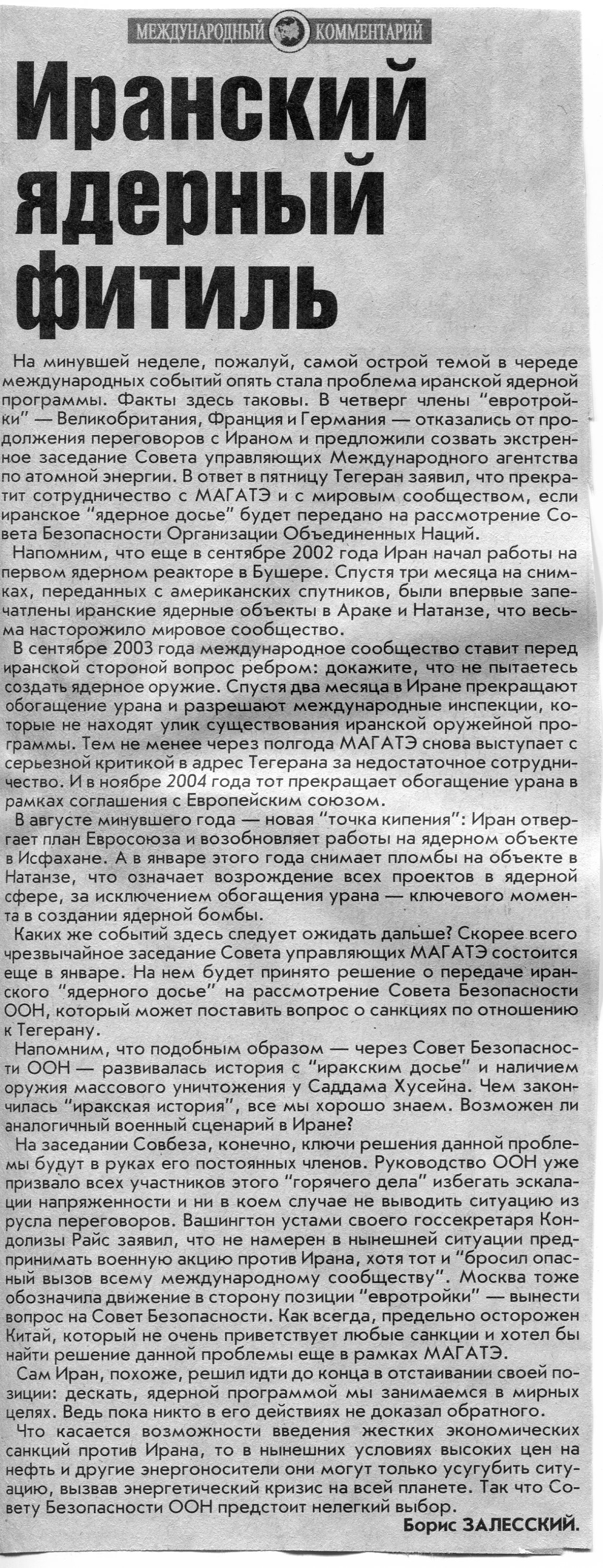 Залесский, Б. Иранский ядерный фитиль / Б. Залесский // Вечерний Минск. - 2006. - 16 янв.
