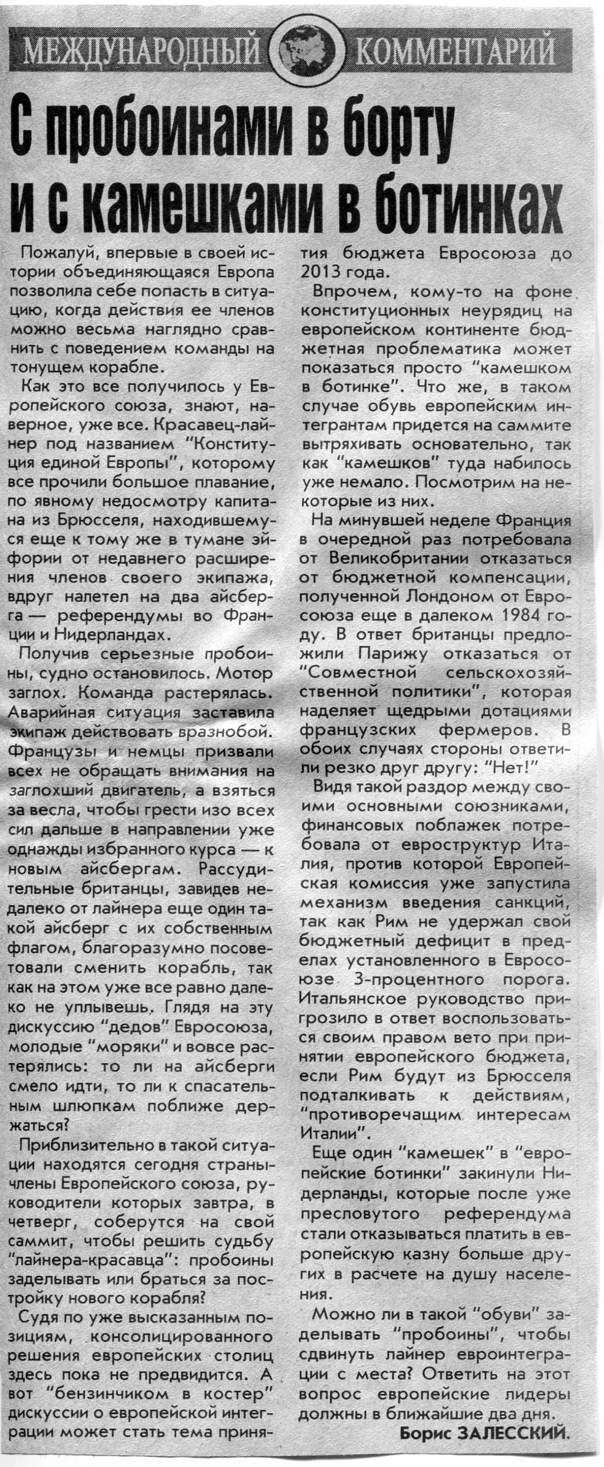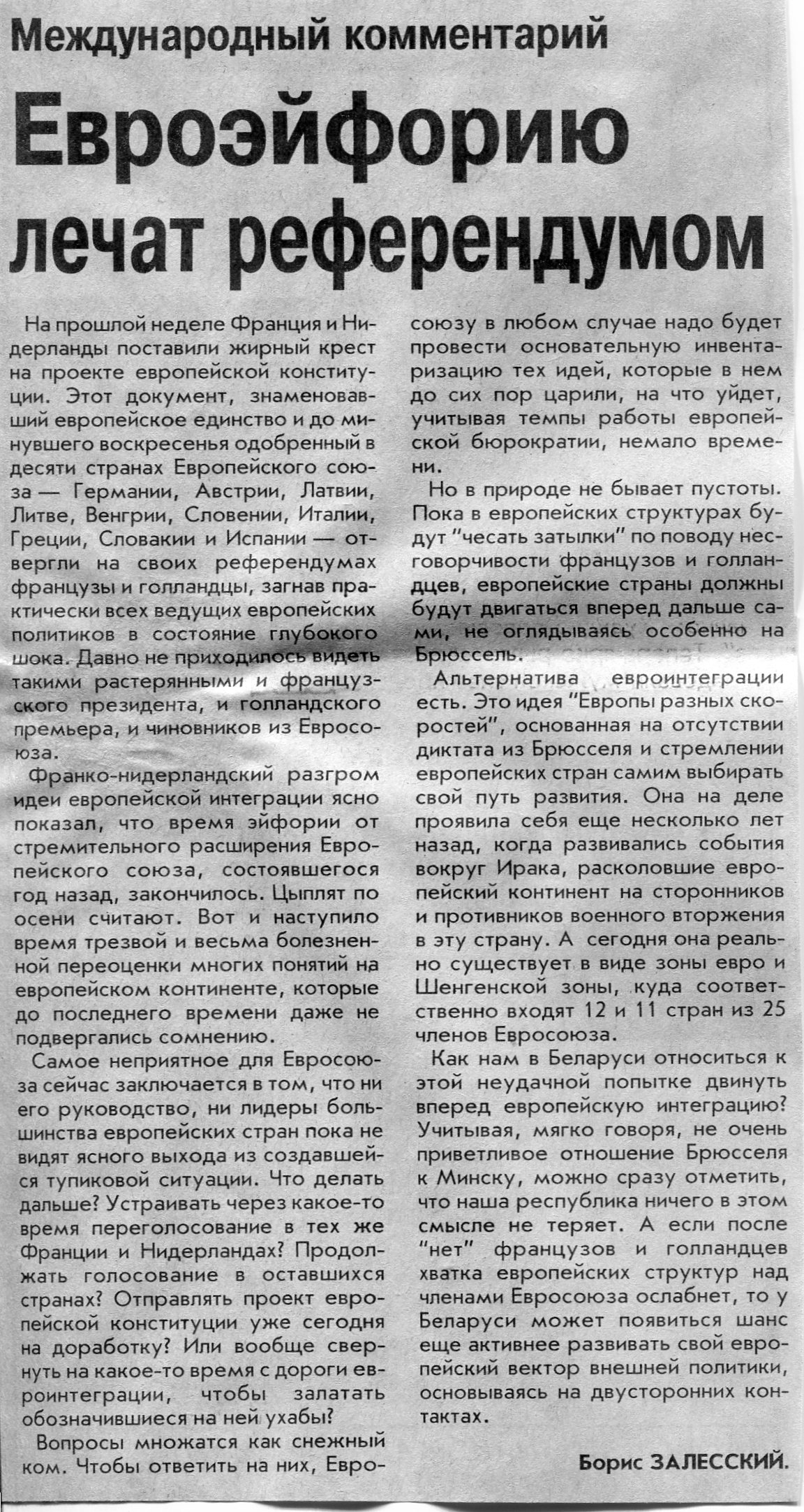 Залесский, Б. Евроэйфорию лечат референдумом / Б. Залесский // Вечерний Минск. - 2005. - 6 июн.