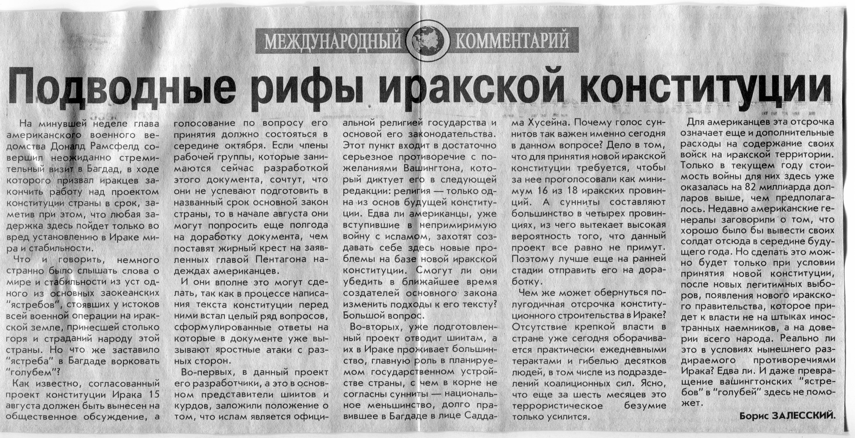 Залесский, Б. Подводные рифы иракской конституции / Б. Залесский // Вечерний Минск. - 2005. - 1 авг.