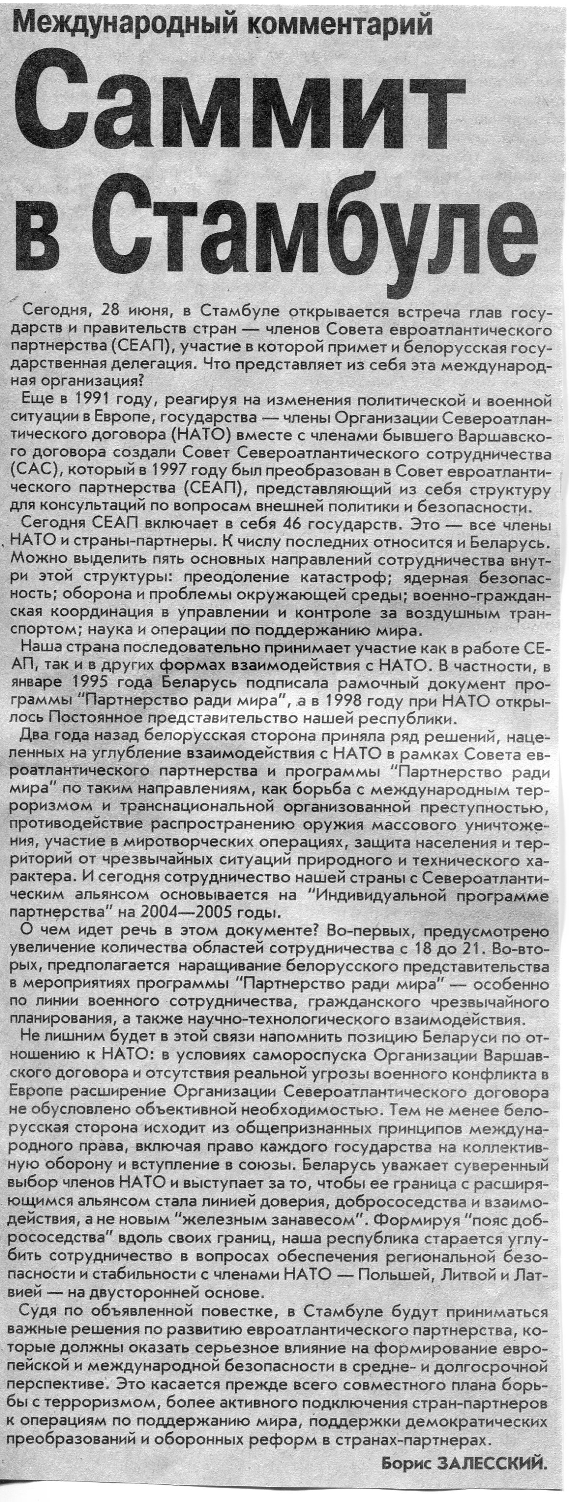 Залесский, Б. Саммит в Стамбуле / Б. Залесский // Вечерний Минск. - 2004. - 28 июн.