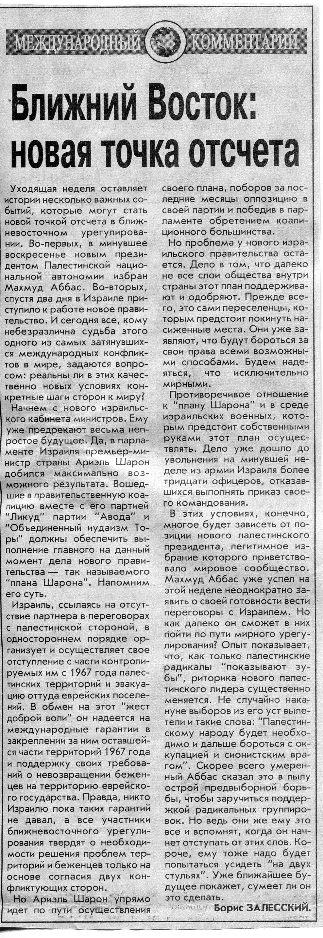 Залесский, Б. Ближний Восток: новая точка отсчета / Б. Залесский // Вечерний Минск. - 2005. - 14 янв.