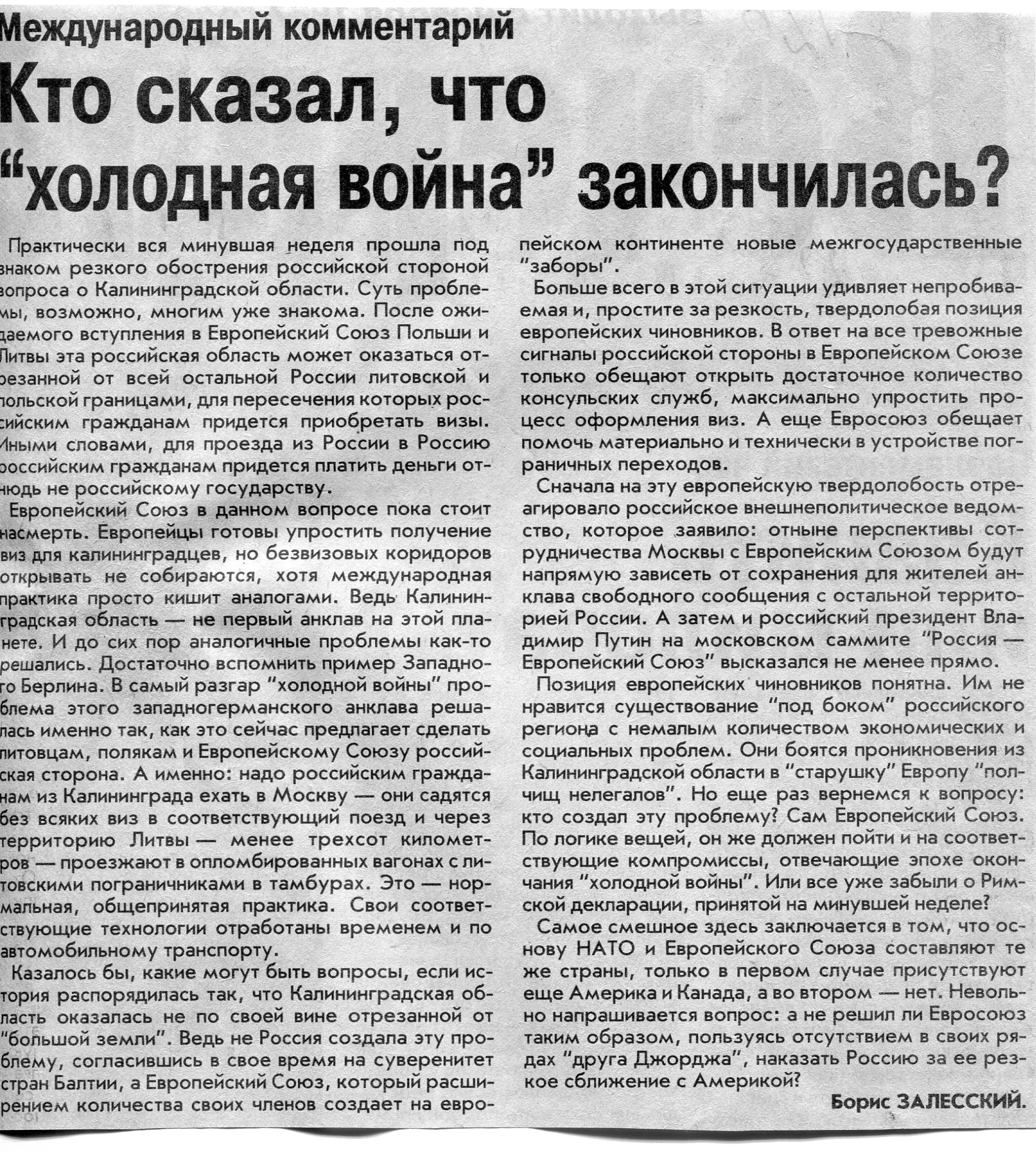 Залесский, Б. Кто сказал, что "холодная война" закончилась? / Б. Залесский // Вечерний Минск. - 2002. - 3 июн.