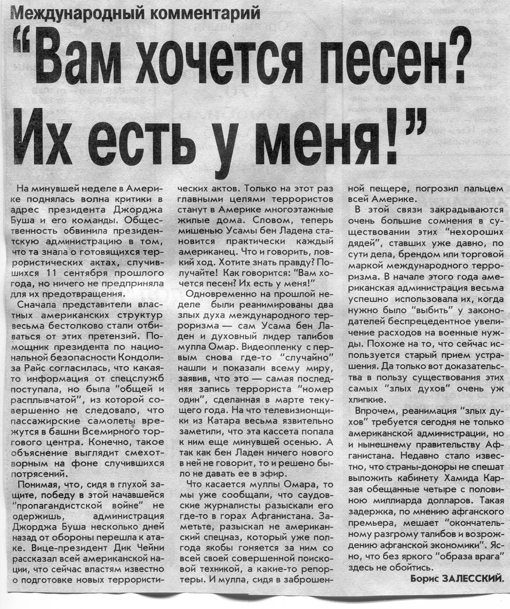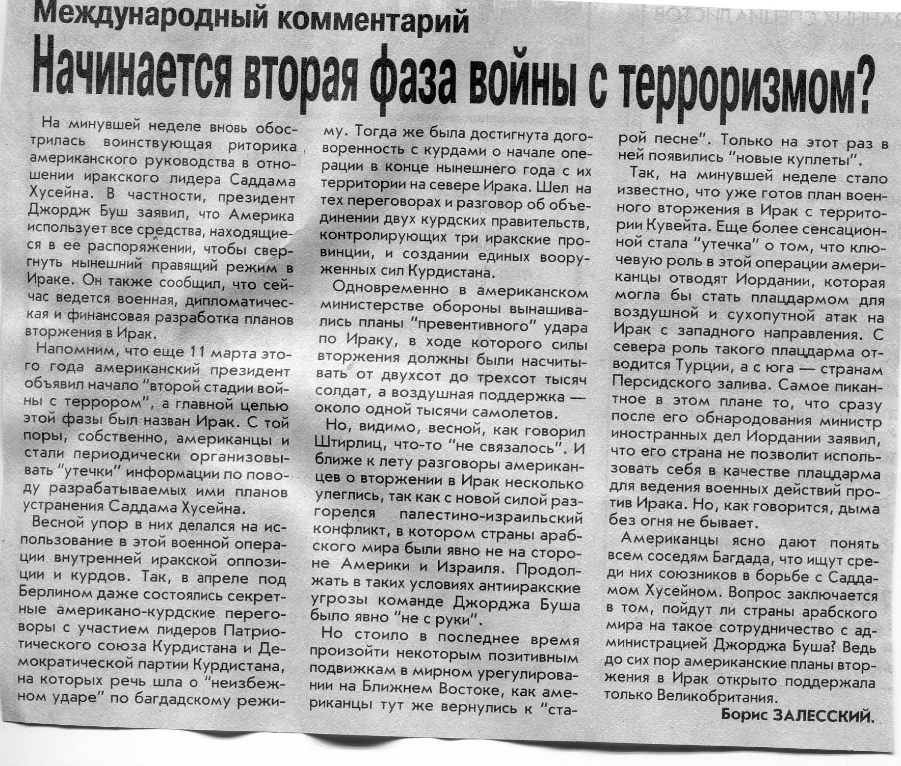 Залесский, Б. Начинается вторая фаза войны с терроризмом? / Б. Залесский // Вечерний Минск. - 2002. - 15 июл.