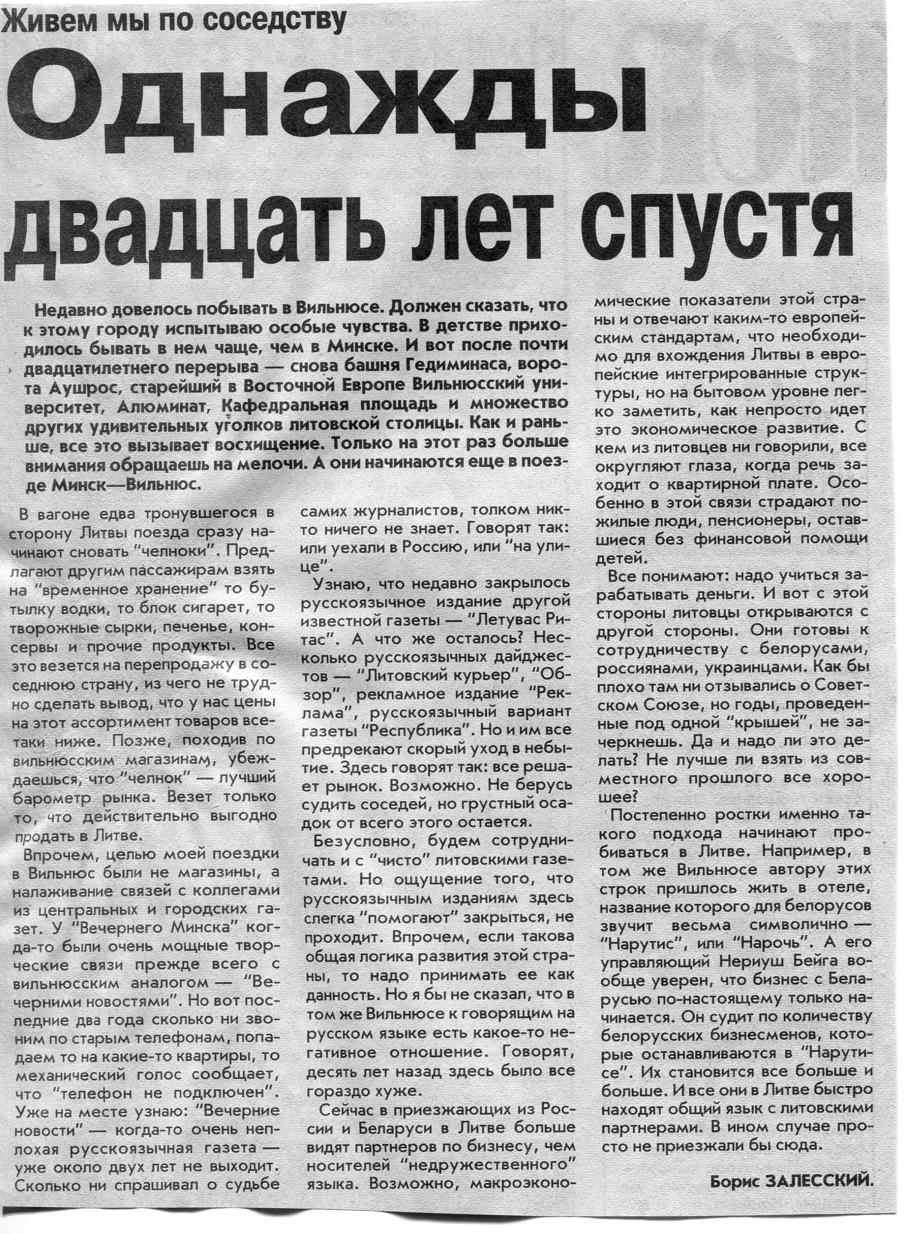 Залесский, Б. Однажды двадцать лет спустя / Б. Залесский // Вечерний Минск. - 2002. - 11 мая.