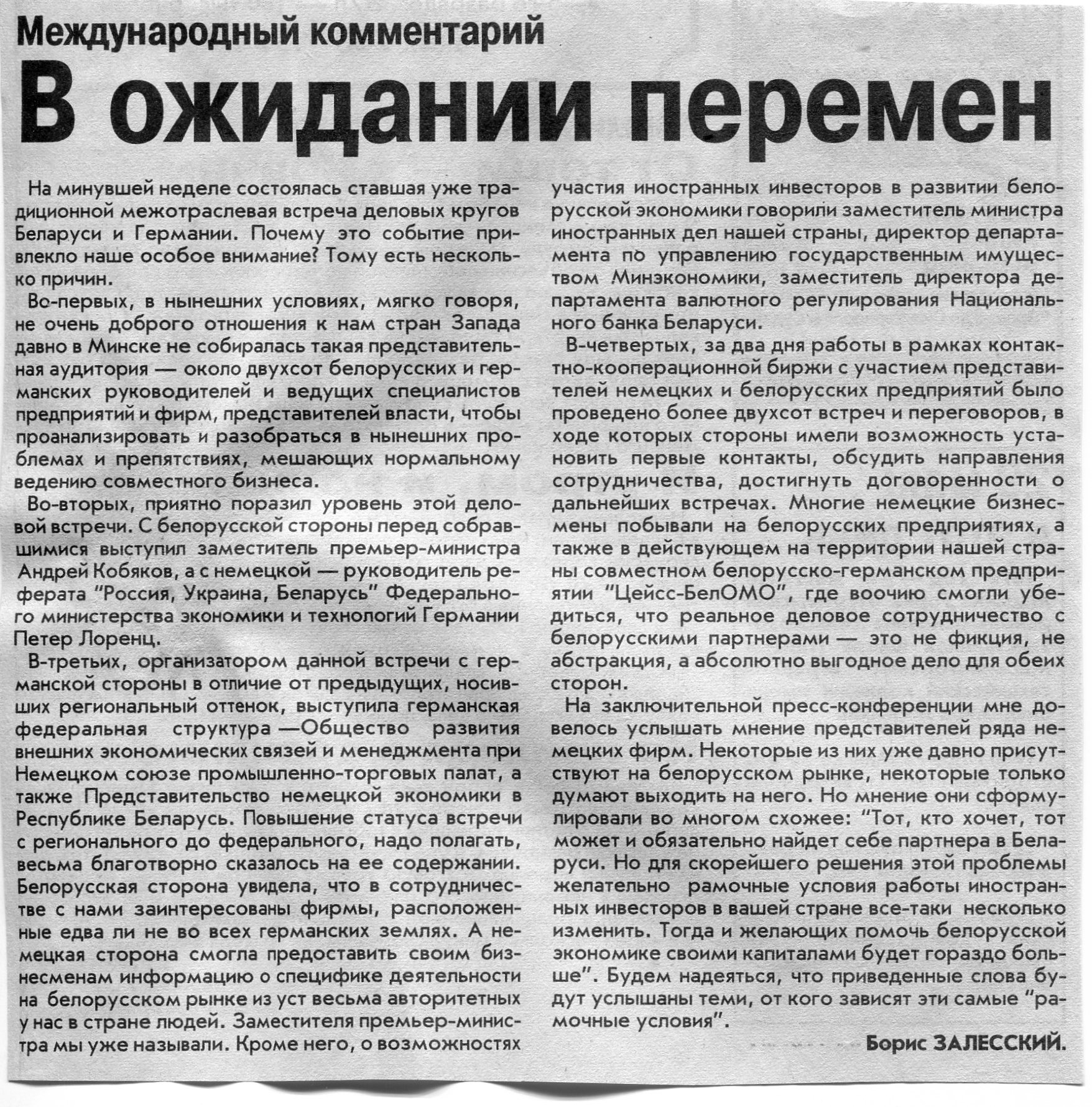 Залесский, Б. В ожидании перемен / Б. Залесский // Вечерний Минск. - 2002. - 29 мая.