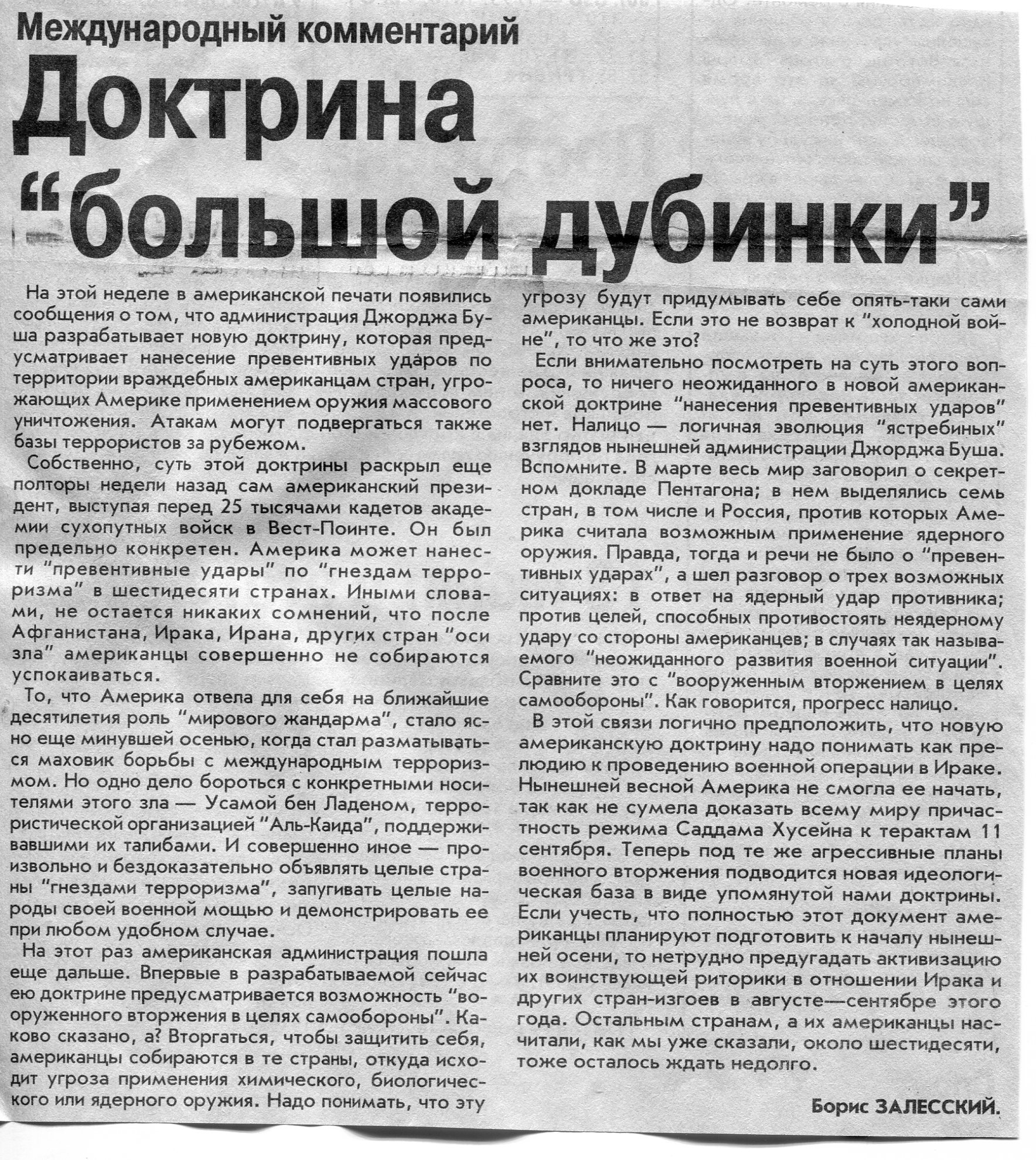 Залесский, Б. Доктрина "большой дубинки" / Б. Залесский // Вечерний Минск. - 2002. - 13 июн.