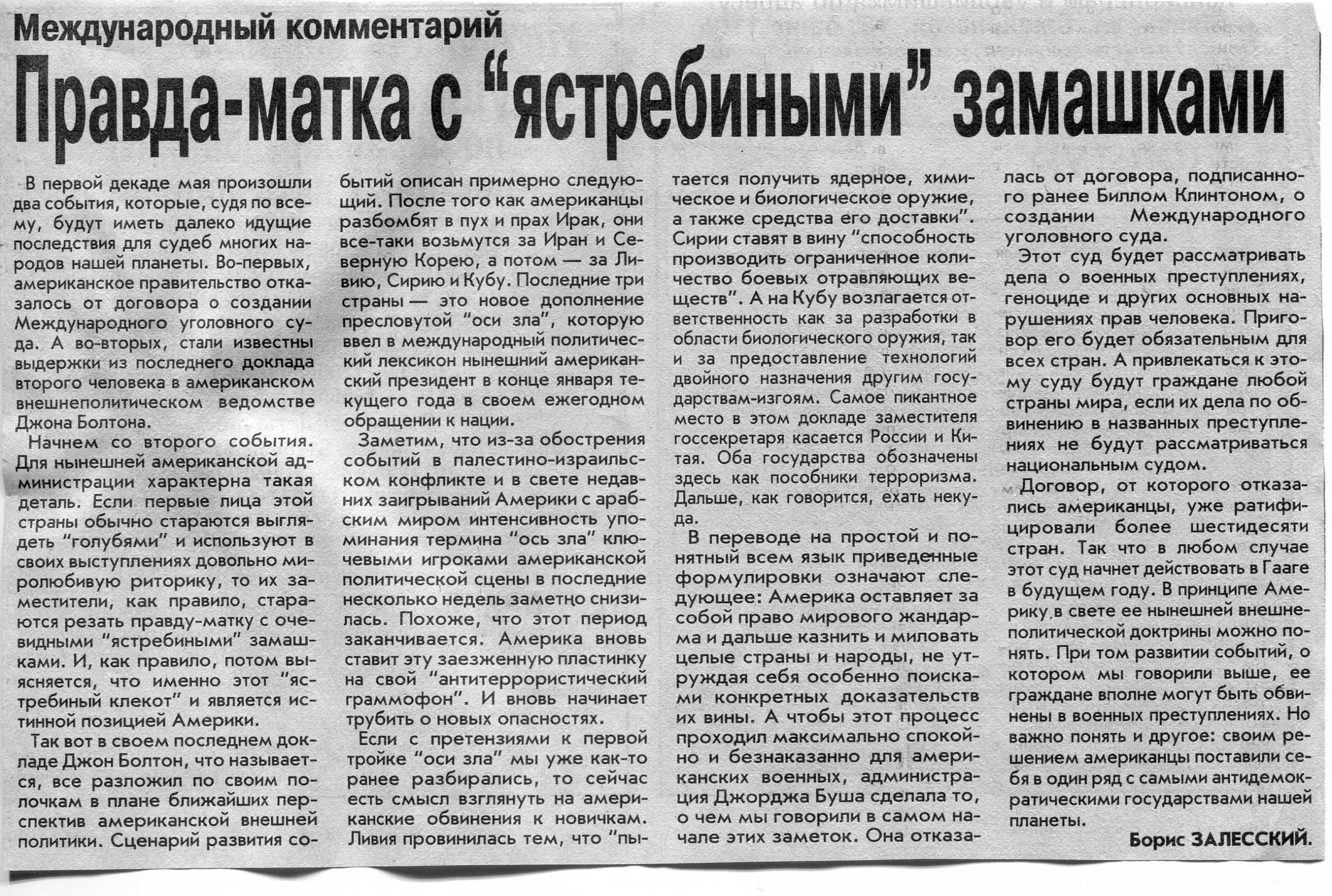 Залесский, Б. Правда-матка с "ястребиными" замашками / Б. Залесский // Вечерний Минск. - 2002. - 20 мая.