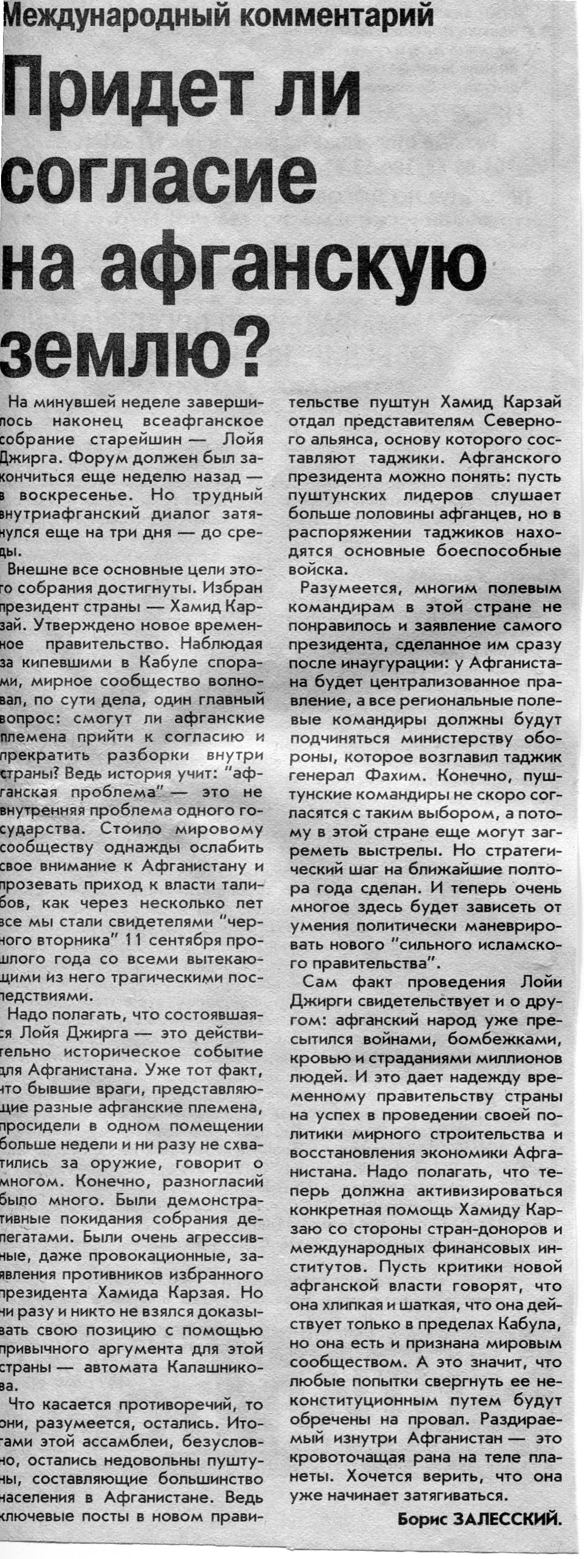 Залесский, Б. Придет ли согласие на афганскую землю? / Б. Залесский // Вечерний Минск. - 2002. - 24 июн.