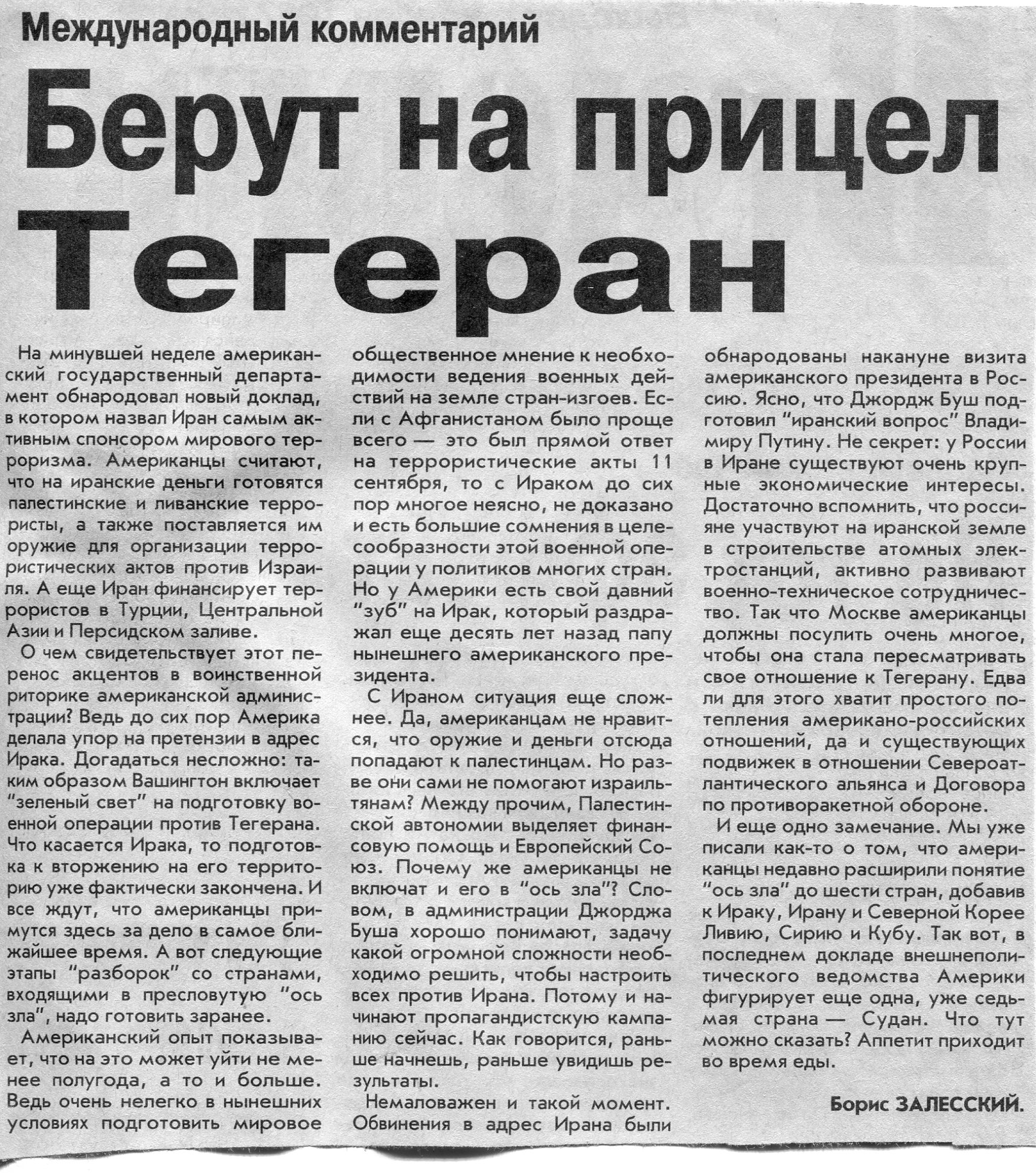 Залесский, Б. Берут на прицел Тегеран / Б. Залесский // Вечерний Минск. - 2002. - 27 мая.