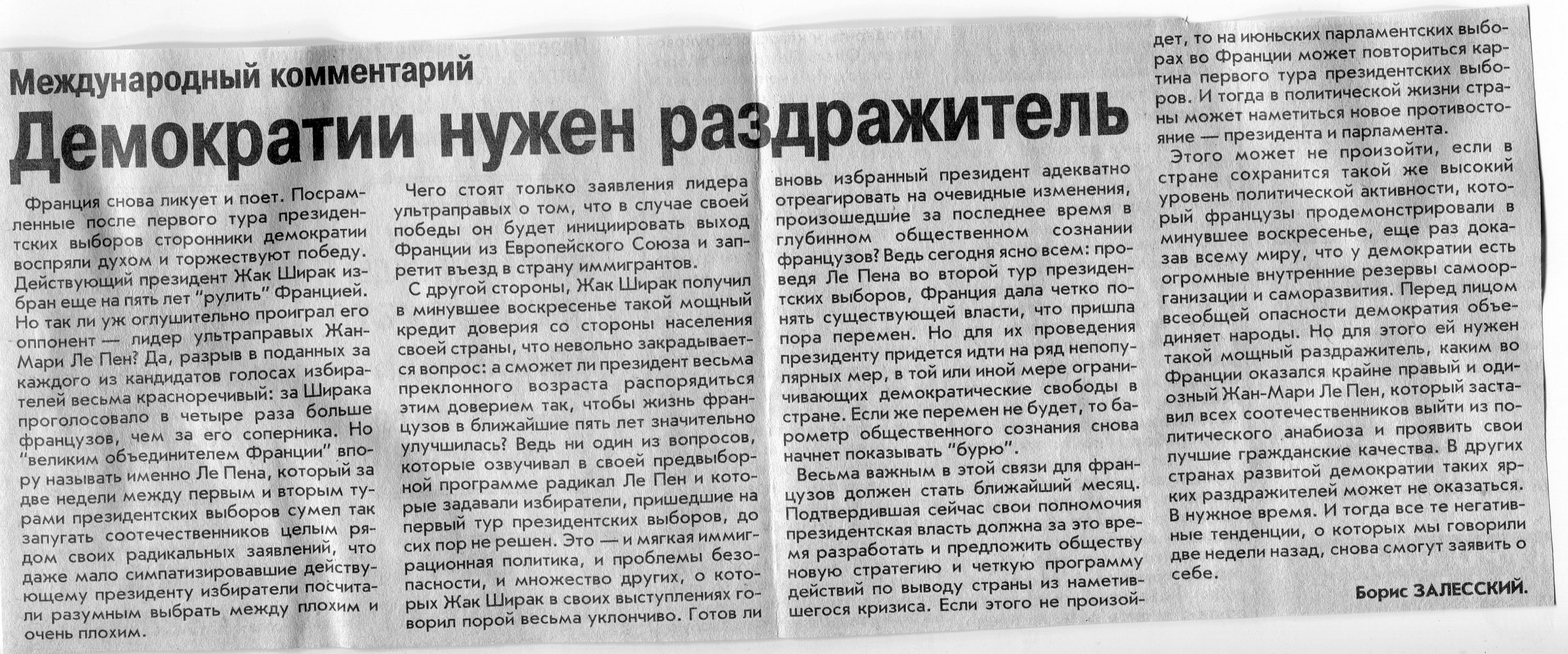 Залесский, Б. Демократии нужен раздражитель / Б. Залесский // Вечерний Минск. - 2002. - 8 мая.