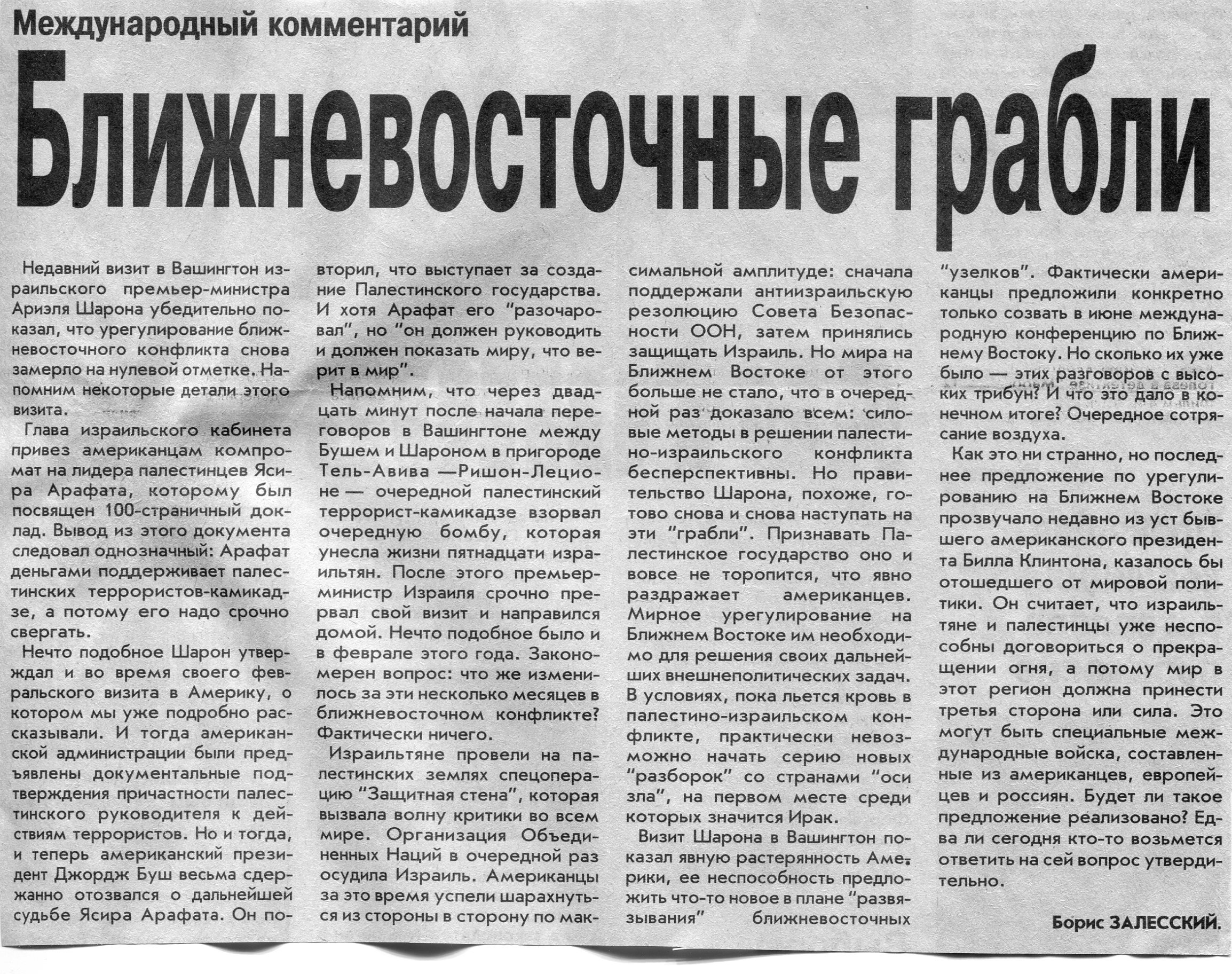 Залесский, Б. Ближневосточные грабли / Б. Залесский // Вечерний Минск. - 2002. - 17 мая.