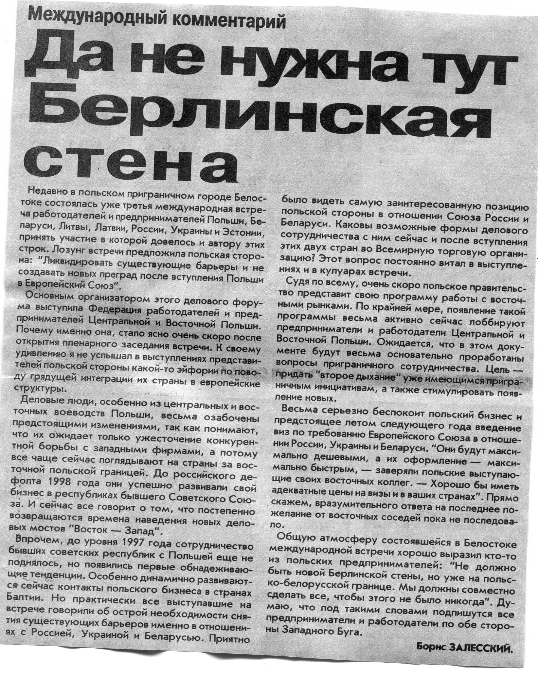 Залесский, Б. Да не нужна тут Берлинская стена / Б. Залесский // Вечерний Минск. - 2002. - 29 апр.
