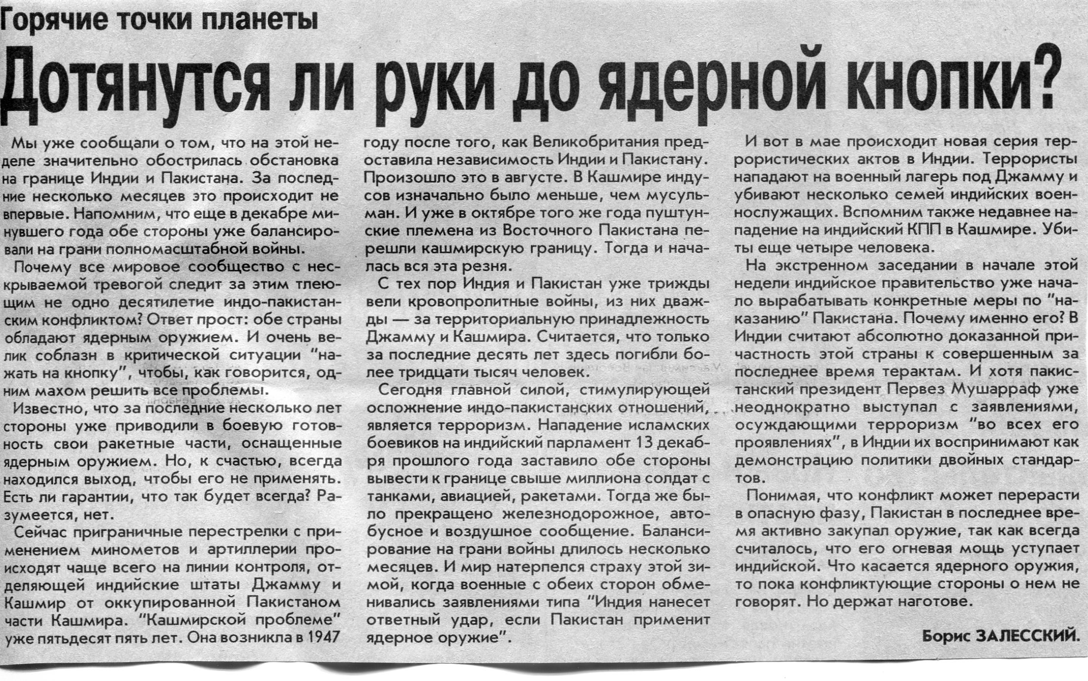 Залесский, Б. Дотянутся ли руки до ядерной кнопки? / Б. Залесский // Вечерний Минск. - 2002. - 24 мая.