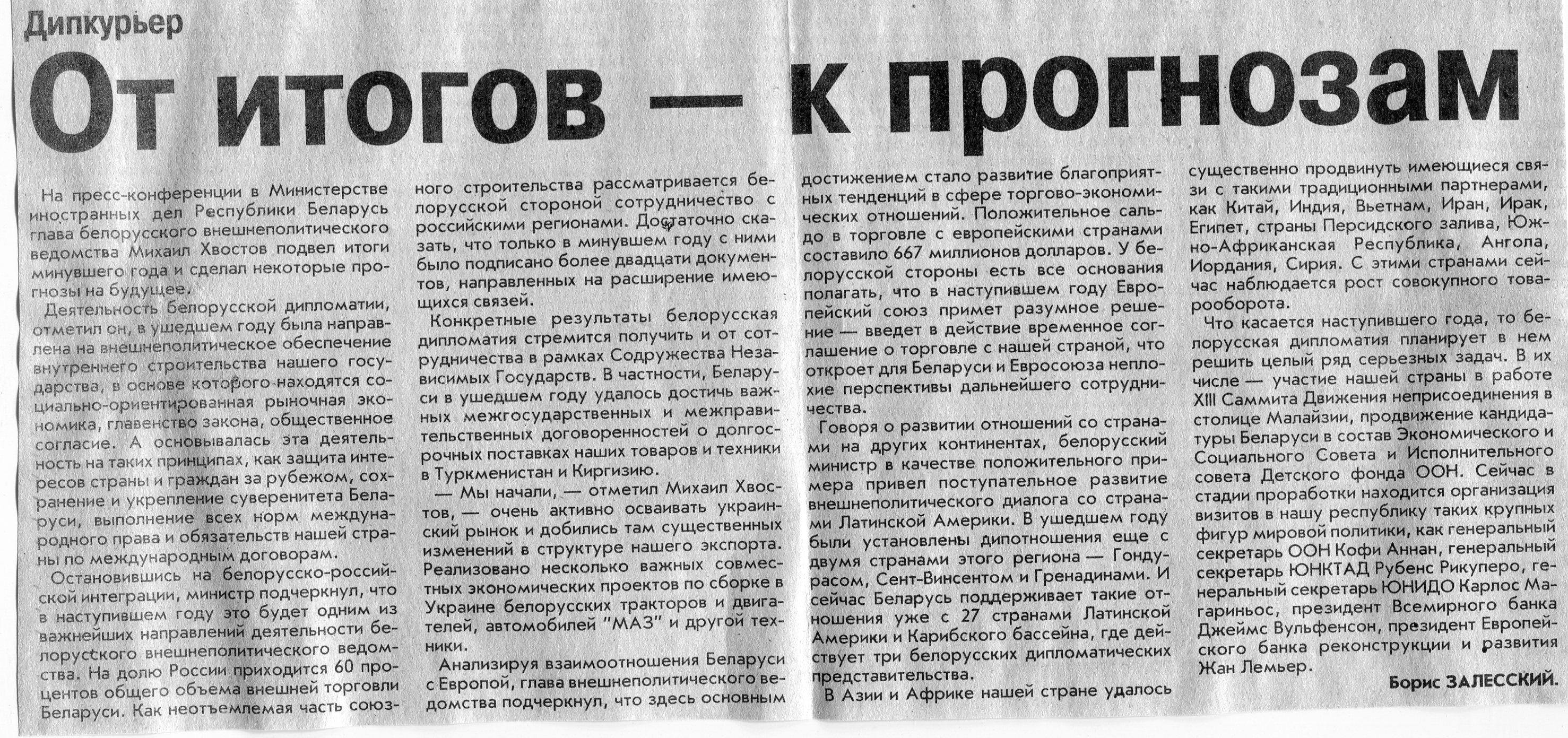 Залесский, Б. От итогов - к прогнозам / Б. Залесский // Вечерний Минск. – 2003. – 13 янв.