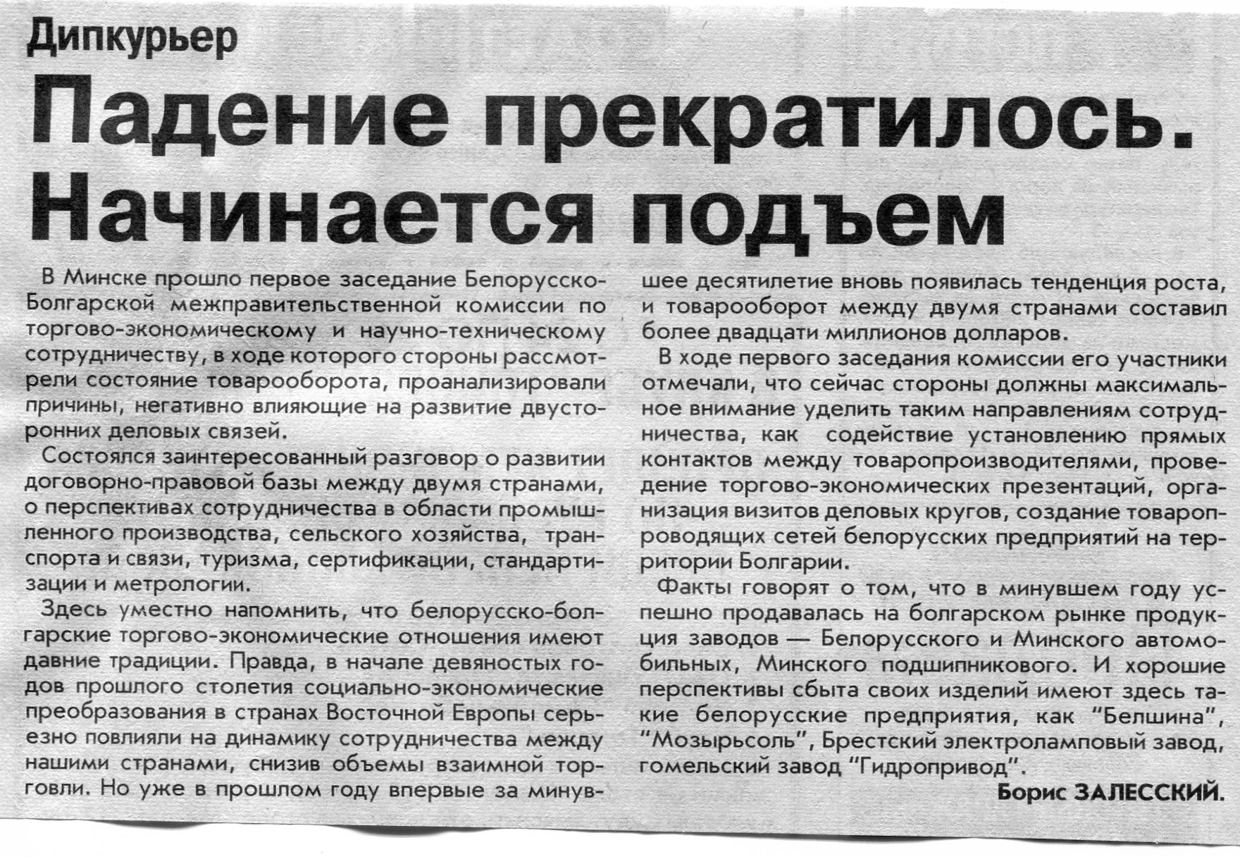 Залесский, Б. Падение прекратилось. Начинается подъем / Б. Залесский // Вечерний Минск. - 2003. - 20 мар.
