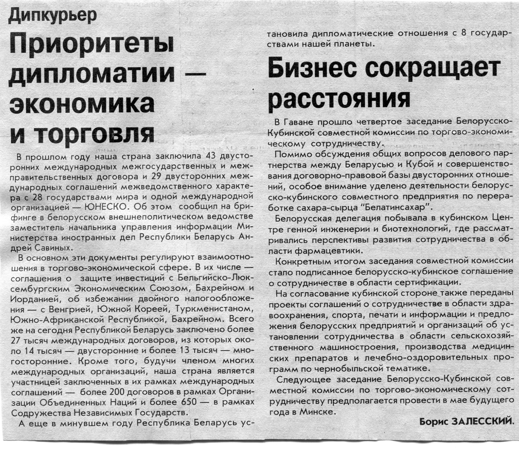 Залесский, Б. Дипкурьер / Б. Залесский // Вечерний Минск. - 2003. - 6 мар.