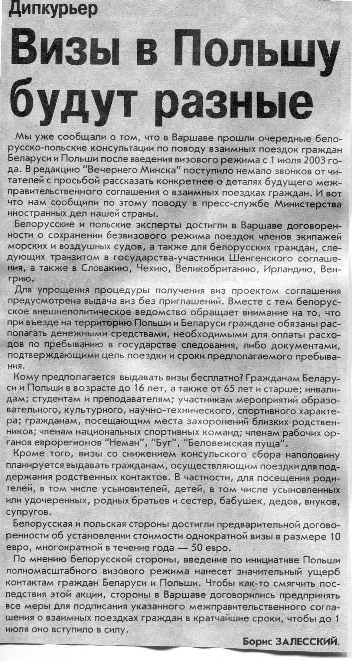 Залесский, Б. Визы в Польшу будут разные / Б. Залесский // Вечерний Минск. - 2003. - 19 мая.