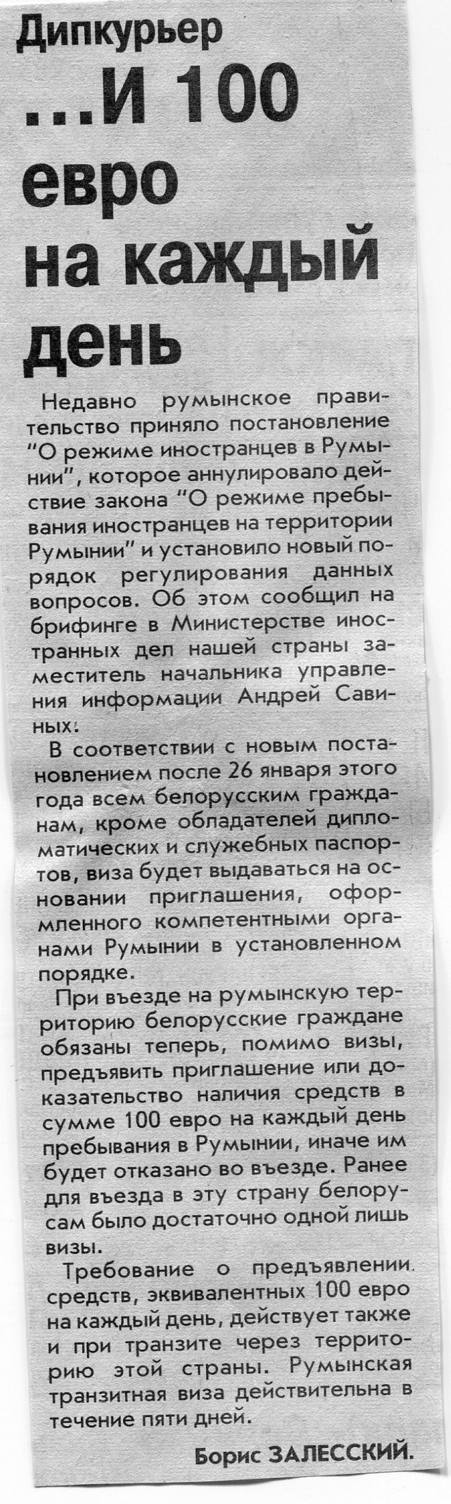 Залесский, Б. ... И 100 евро на каждый день / Б. Залесский // Вечерний Минск. - 2003. - 29 янв.