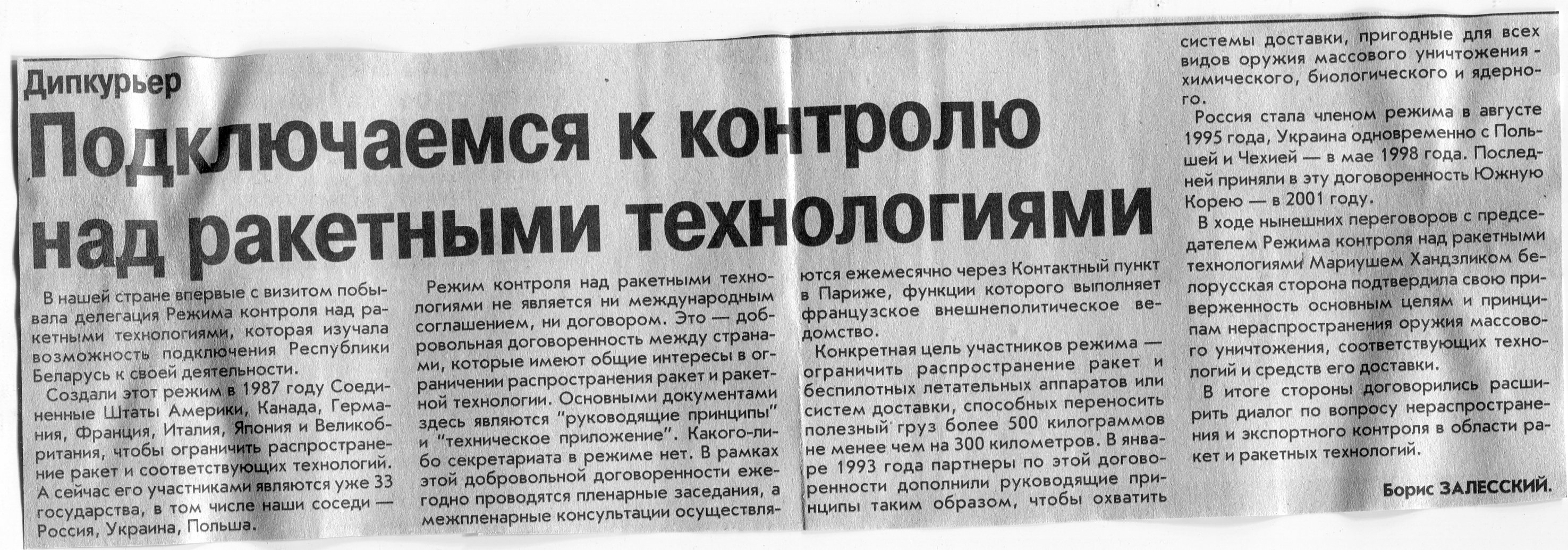 Залесский, Б. Подключаемся к контролю над ракетными технологиями / Б. Залесский // Вечерний Минск. – 2003. – 21 мая.