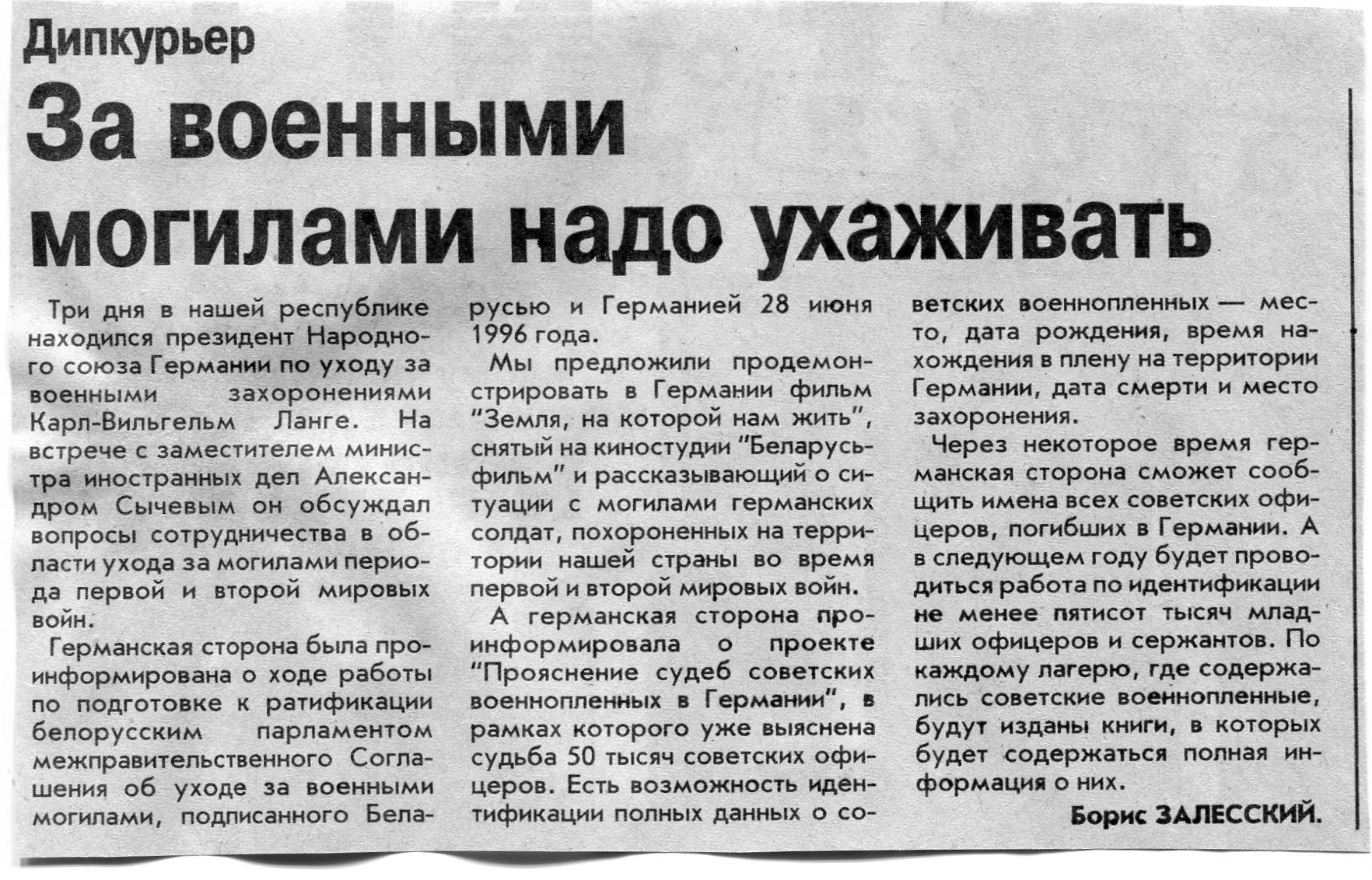 Залесский, Б. За военными могилами надо ухаживать / Б. Залесский // Вечерний Минск. - 2001. - 12 дек.